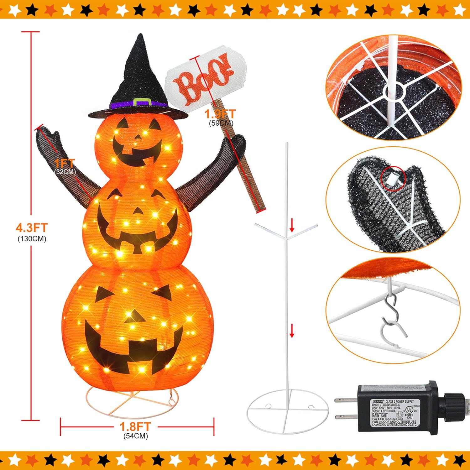 - Package Include: 1 x Collapsible pumpkin(with light), 2 x support poles,1 x ring bottom,4 x ground nails,1 x placard,2 x arms,1 x black cape(DIY cut),1 x transformer. The installed height is 4.3 Ft(about 1.3 m).