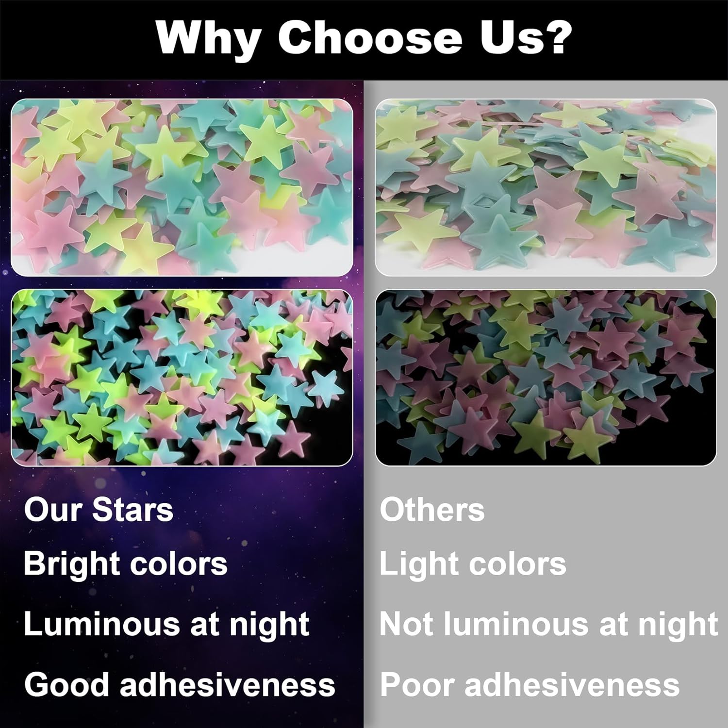 - What you will get:200 mixed-color night light stars, two stickers, and a free luminous moon. 【Tips】For best results, avoid installing on textured walls, rough concrete, limewash walls, as the sticker may not stick as expected. Clean the wall before pasting to achieve better pasting effect. The pink and blue stars are decorative during the day and emit a faint fluorescent green effect at night, which may not be as bright as the green stars.