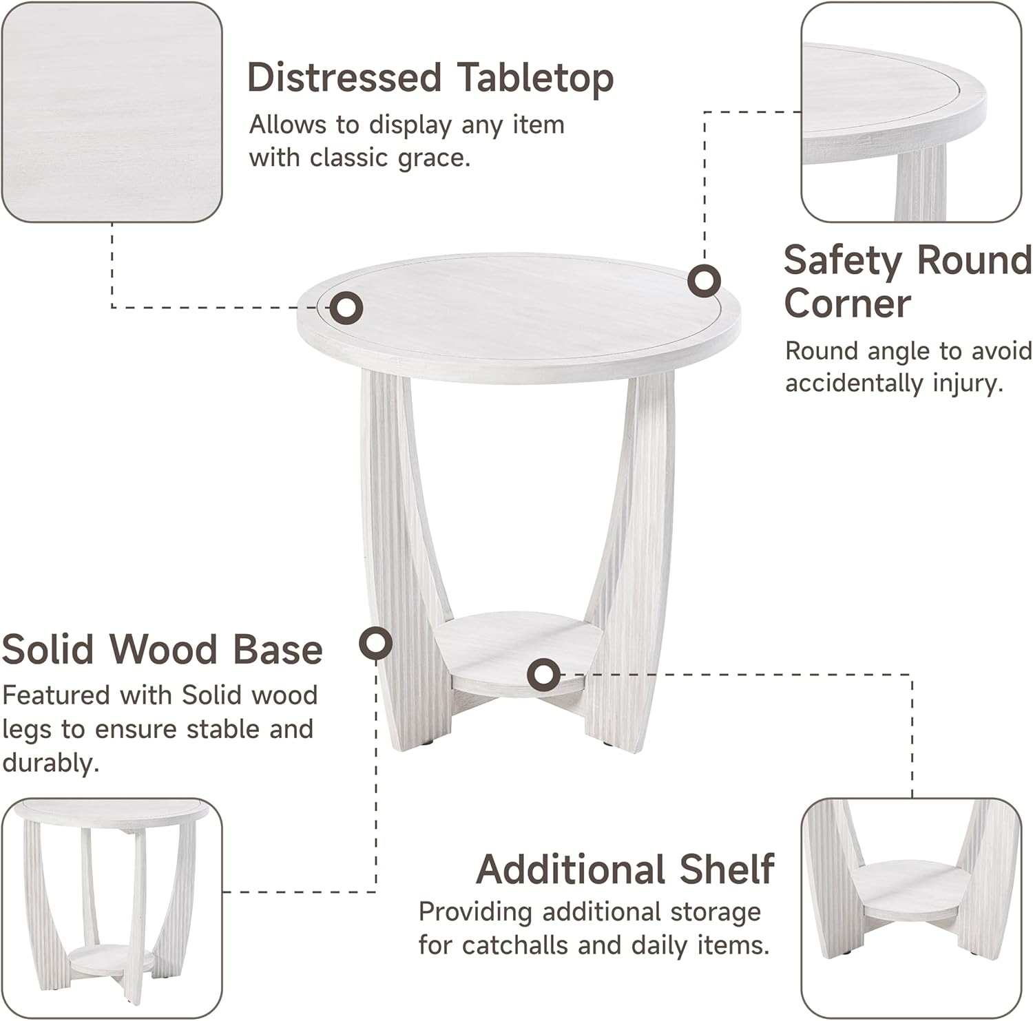 - ✅【Elegant Farmhouse Design】: This end table exudes rustic charm with a contemporary twist, featuring a white distressed finish that complements the farmhouse aesthetic. The vertical striped design on the solid legs adds a textural element that is both visually appealing and sophisticated.