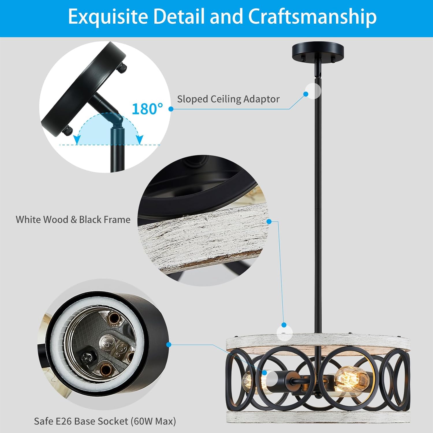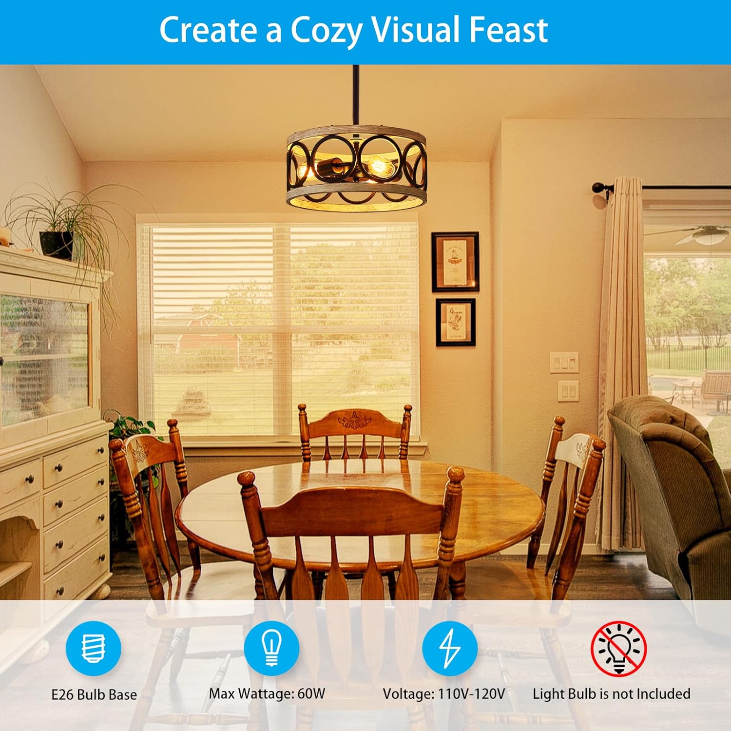 - EXQUISITE DESIGN: Make your dining room look stunning with this farmhouse chandelier. Its unique open drum frame, with an antique wood grain and white finish, adds a touch of rustic charm to any decor style. Unlike plastic chandeliers, this one is made of durable metal and is sure to impress.