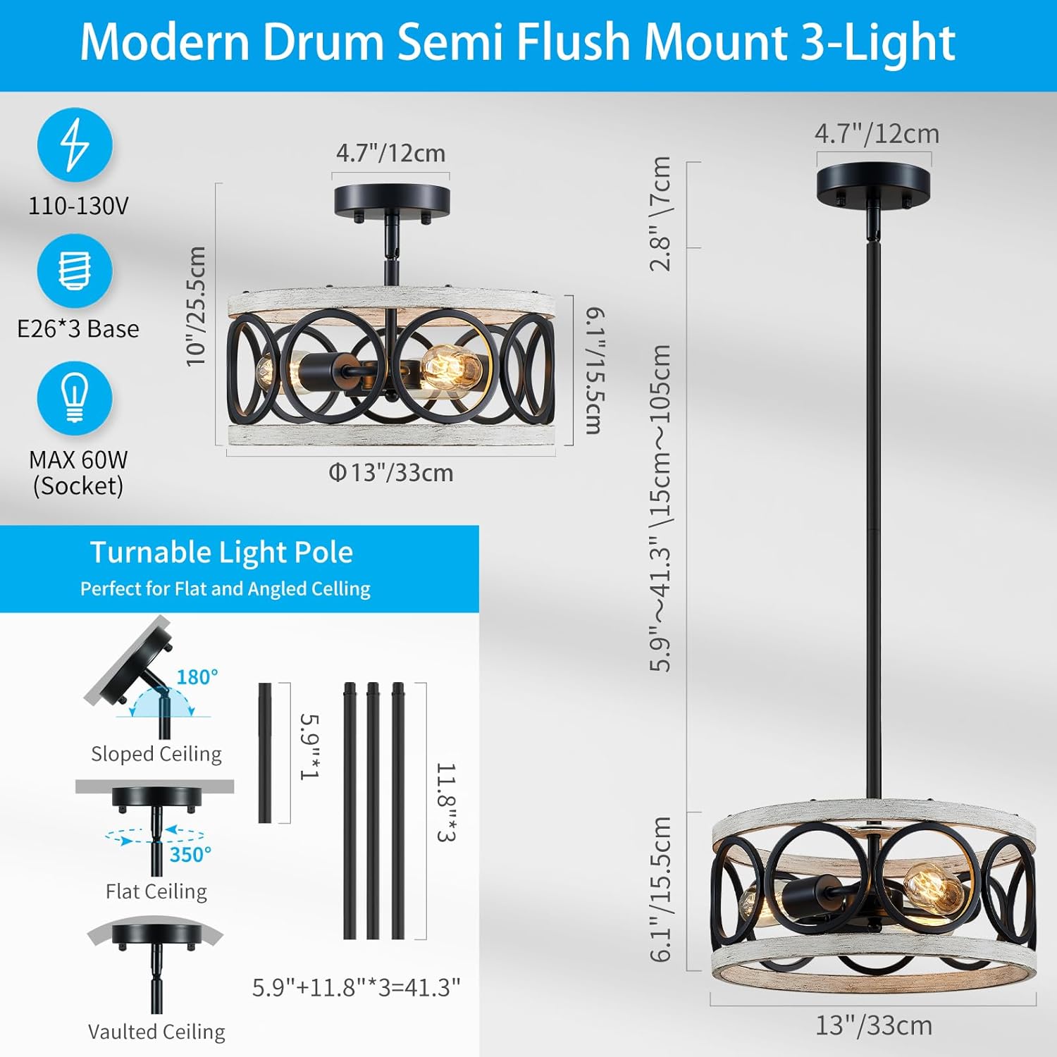 - DIMENSIONS: This round chandelier is 13" in diameter and 6.1" in height. It comes with four hanging rods, including one 5.9" and three 11.8" rods, allowing for an adjustable length of up to 41.3". Whether you're looking to add ambiance to your living room, dining room, bedroom, or even your restaurant or bar, this light fixture will illuminate your space beautifully.