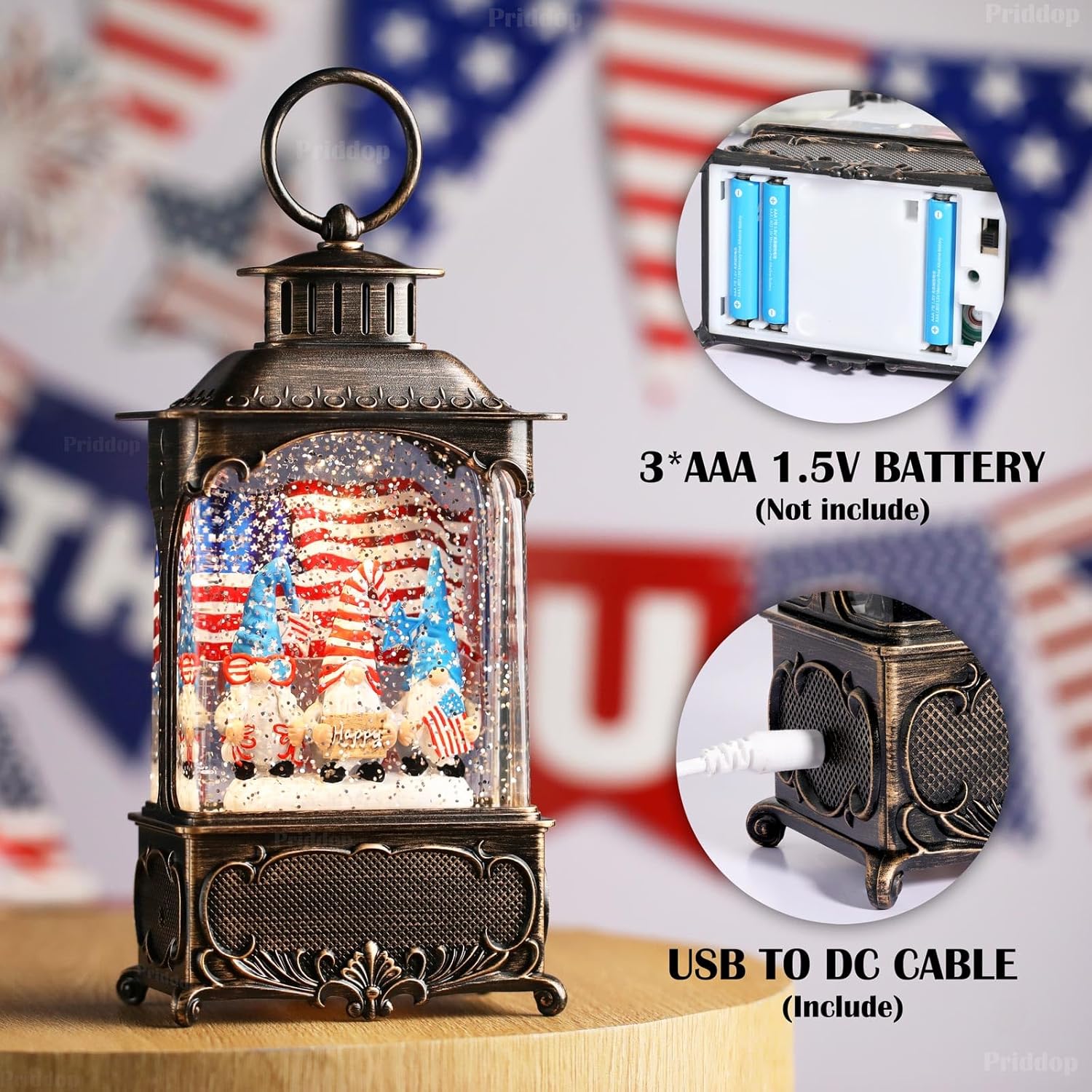 Gnome Snow Globe Lantern 4th of July Decorations with Timer, USB and Battery Powered 4th of July Shirts Patriotic Gnomes and American Flag Independence Day 10.2 inch