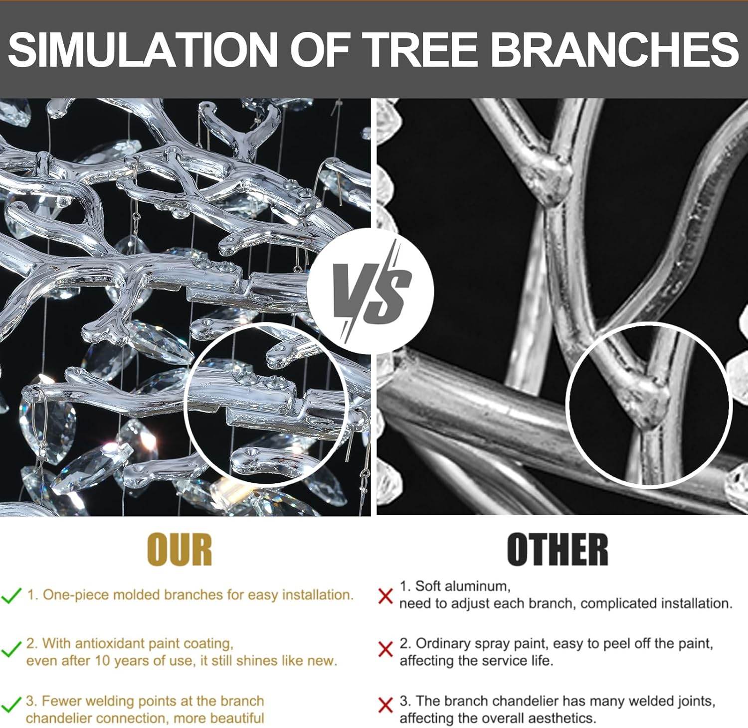 - 【Modern Crystal Chandelier】Transform your living space into a captivating masterpiece with our Elegant Crystal Tree Branches Chandelier. This stunning chandelier is designed to impress, featuring a unique tree branch-inspired design adorned with glistening crystals that cast a mesmerizing play of light and shadow.