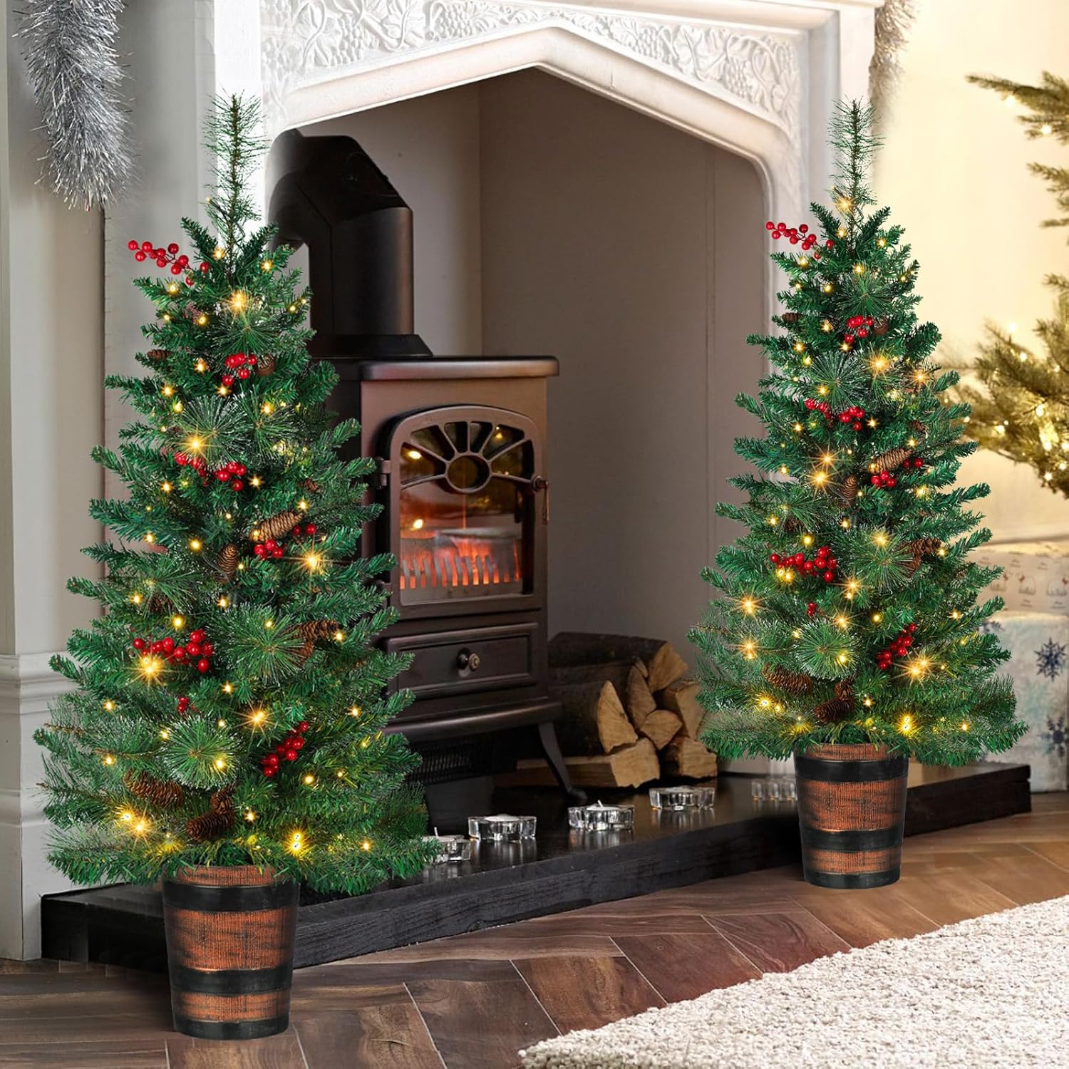 Set of 2 Christmas Trees with Lights 4-FT Artificial Potted Porch Berries and Pinecone Christmas Tree Battery Powered with 8 Modes and Timer for Indoor Outdoor