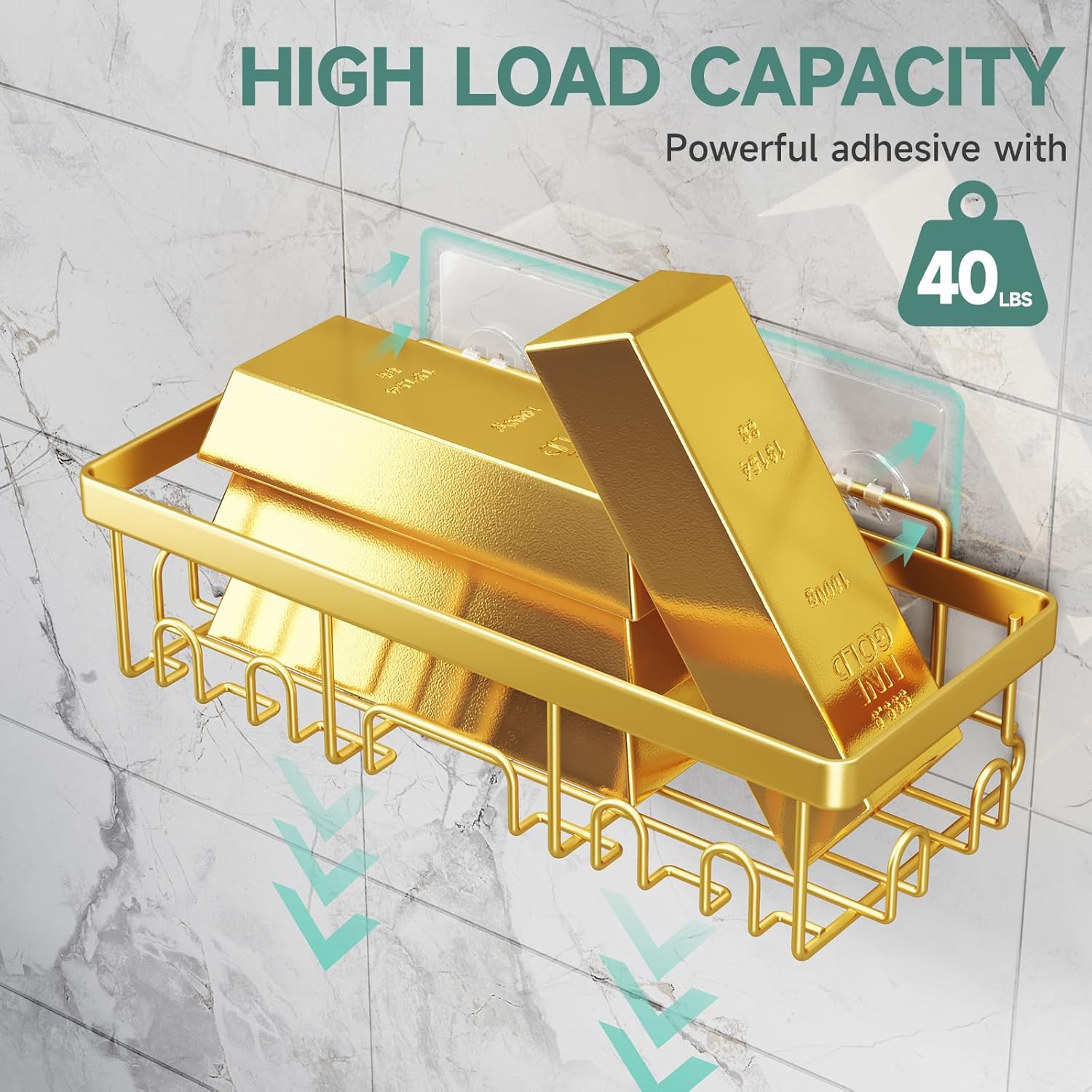 Veken Adhesive Shower Caddy 6-Pack,Gifts for Women Mom,Heavy Weight Bearing,Large Wall Mounted Bathroom Shelves Rack,Organizer Storage Accessories with Soap Dish&Toothbrush Holder,Bright Gold