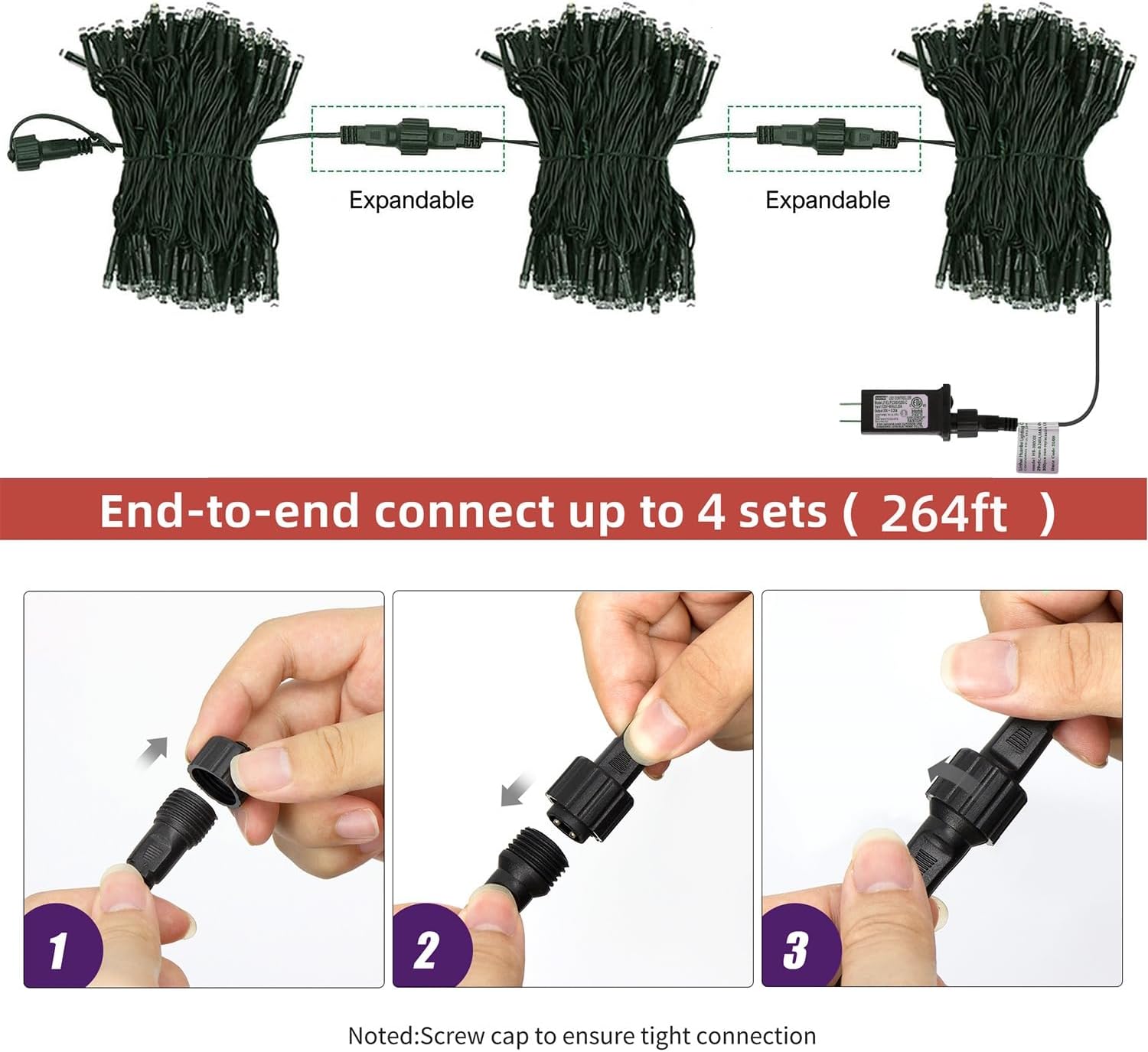 - 66ft Christmas Decorations string lights: With 200 Red & White individual LED bulbs. Each green wire lights has end-to-end connection, you can connect up to 4 sets together to illuminate a wider range. Fit different occasions, moods, feelings, holidays, festivals, anniversaries, etc
