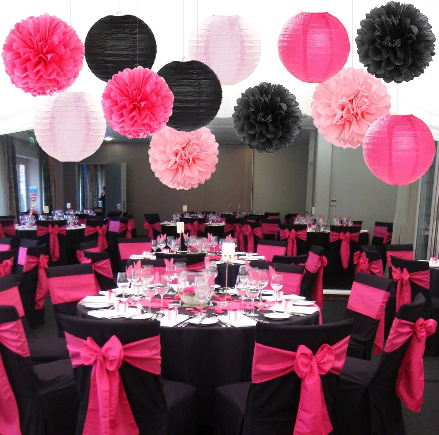 - 【Wide use】These paper lanterns and pom poms are great for indoor and outdoor events such as pink and black graduation decorations,hot pink and black birthday for women,bachelorette party decor.