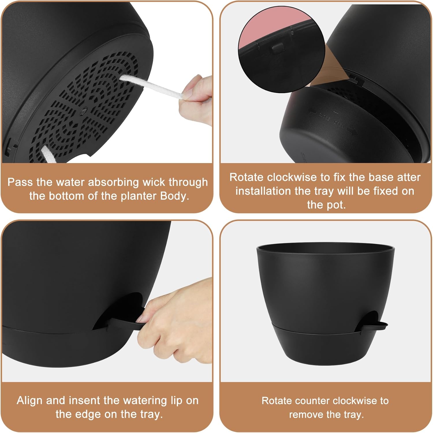 Plant Pots 10/9/8/7.5/7 Inch Self Watering Pots, Set of 5 Plastic Planters with Drainage Holes and Saucers,Plastic Flower Pots,Nursery Planting Pot for Indoor Out Door Plants(All Black)