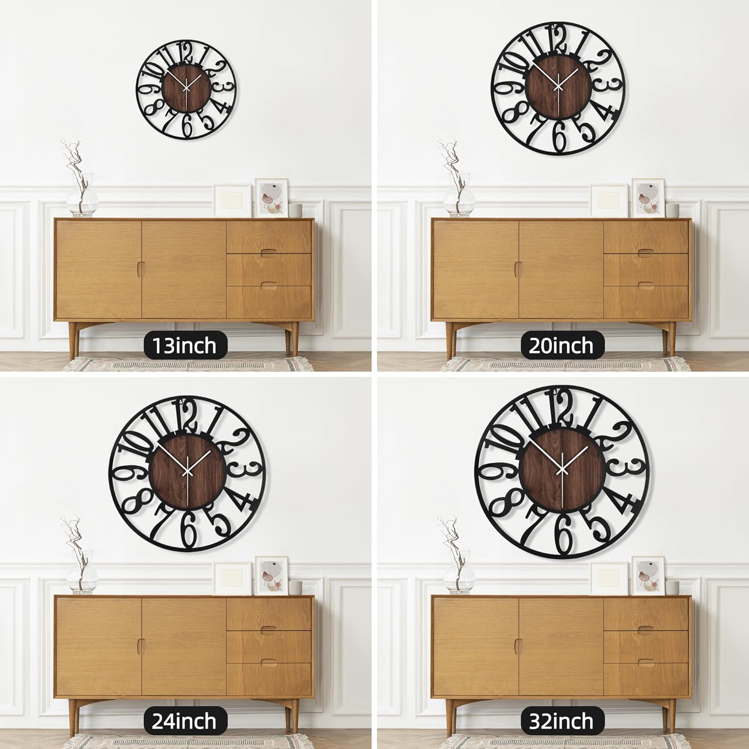 Maxstar Large Round Wall Clock for Living Room Decor Battery Operated Non Ticking Black Metal Wood Clocks for Home Living Room Garden Farmhouse Office Kitchen Decoration -32 inch
