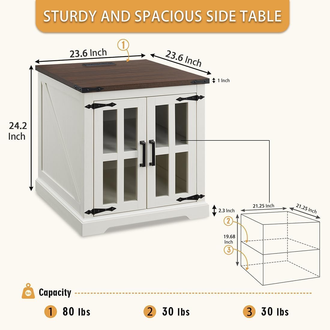 Farmhouse End Table with Charging Station,24" Large Side Table with Glass Barn Door, Rustic Wood Nightstand Bedside Table with Adjustable Storage Shelf for Living Room, Bedroom,White,2 Pack