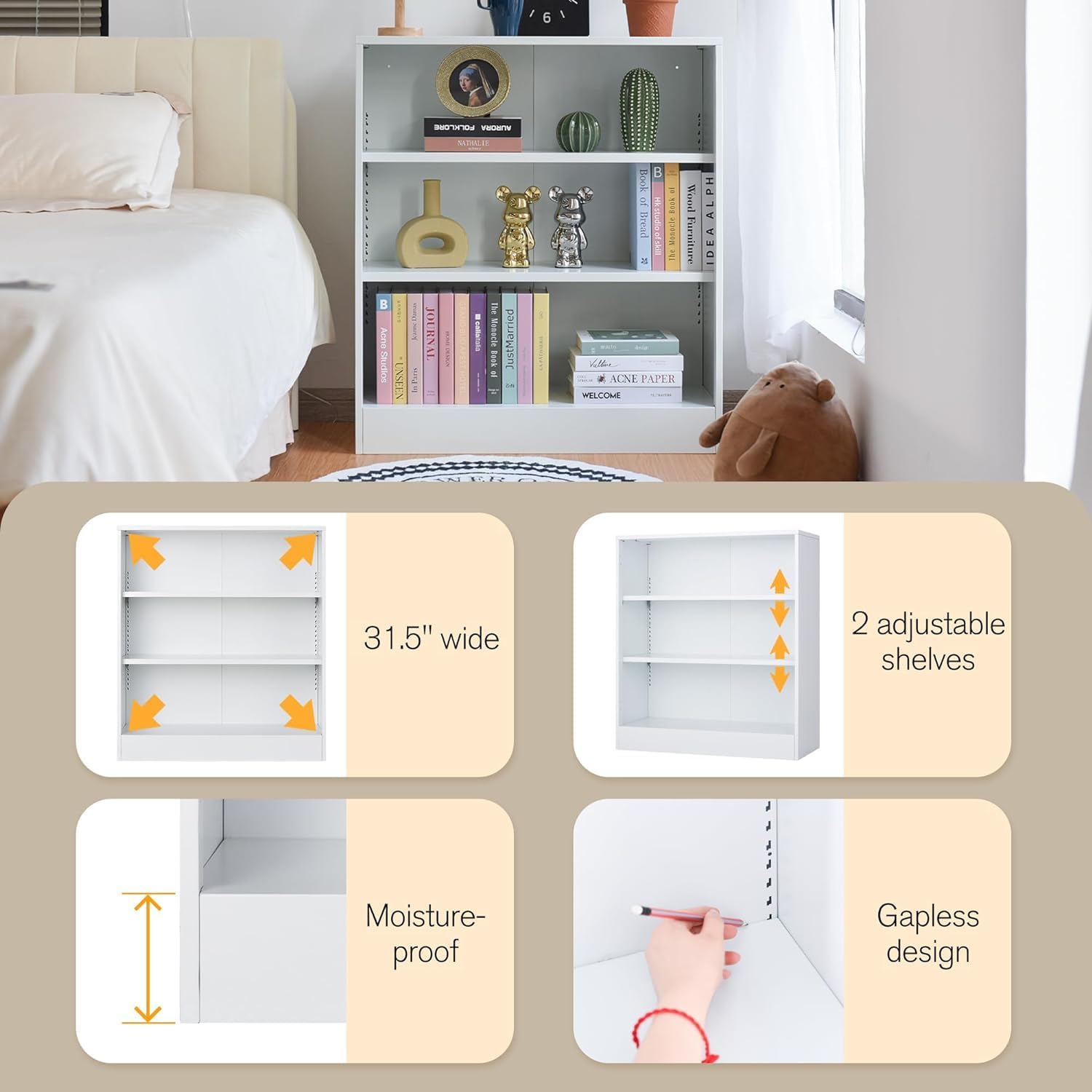 3-Tier Bookshelf with Adjustable Shelves, White Metal Space Saving Storage Shelf Bookcase, Small Open Storage Shelf for Living Room, Home Office, Dinning Room, Pantry (White-36H)