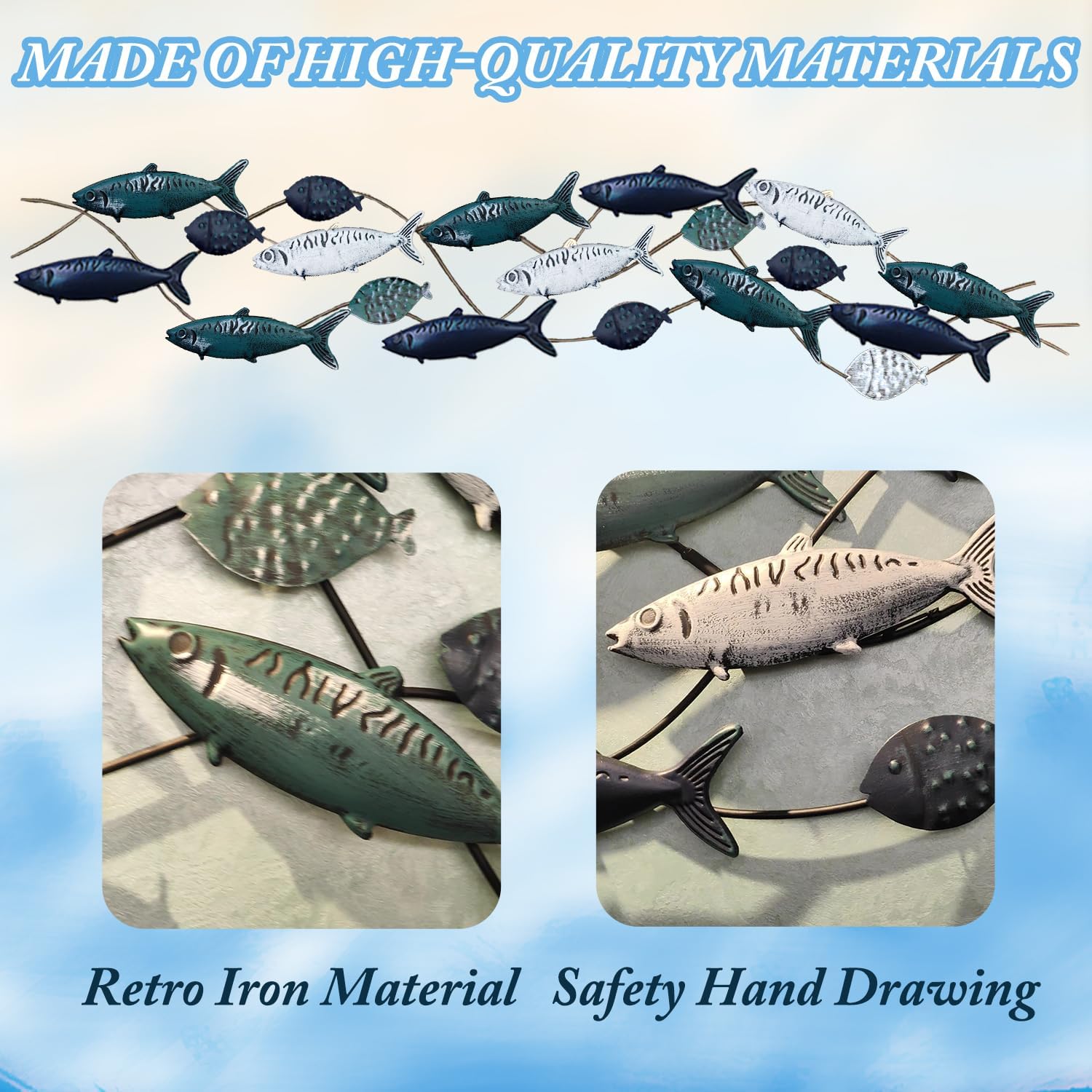 - Metal Fish Wall Décor : 19 lifelike fish frolicking in the water, handmade metal iron crafts, Hand painted old-fashioned fish decoration with a Mediterranean-style marine theme, Smart and elegant, lifelike, retro distressed finish. Large Size 55" x 13"(141 x 34cm).