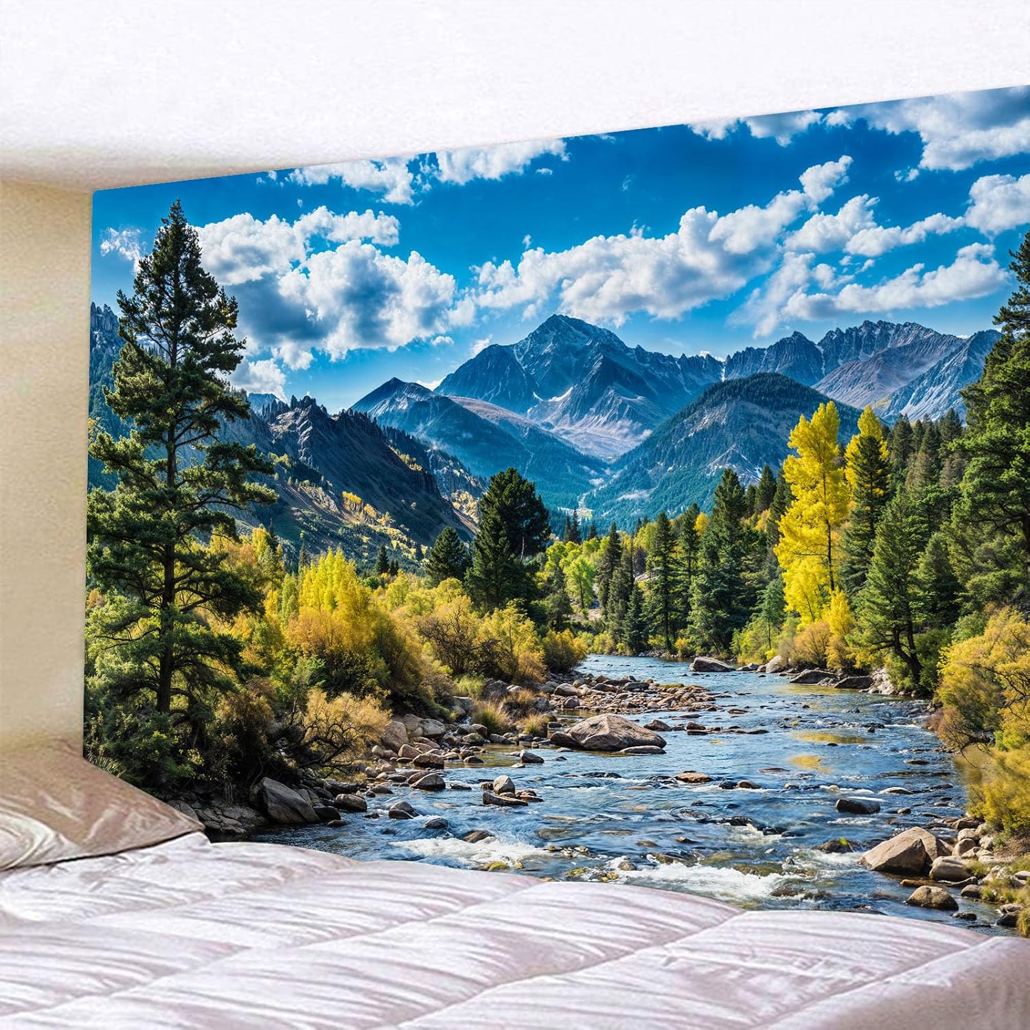 AMM Nature Forest Mountain Tapestry Green Pine Tree Tapestry for Bedroom Aesthetic White Clouds Flowing River Landscape Classroom Tapestries Wall Hanging for Living Room Dorm Office