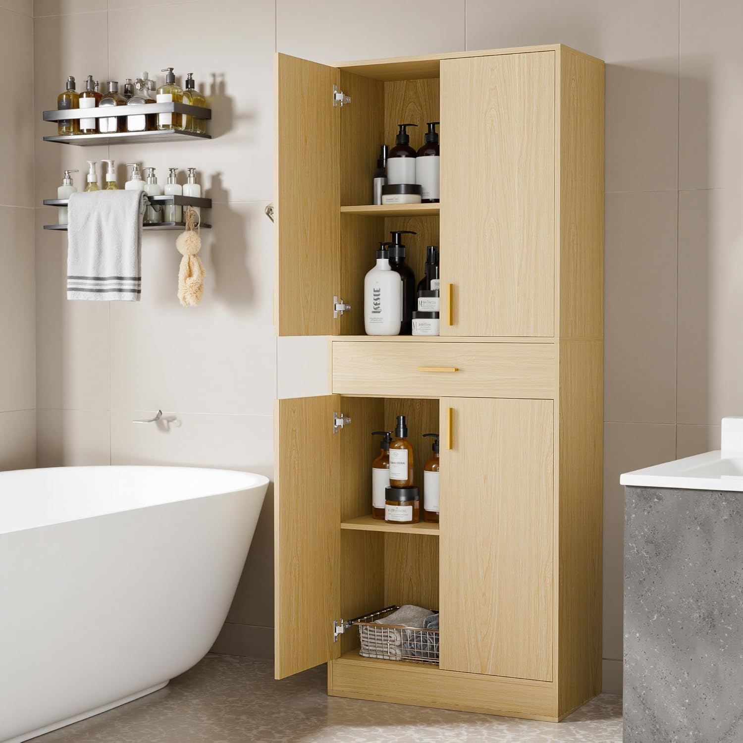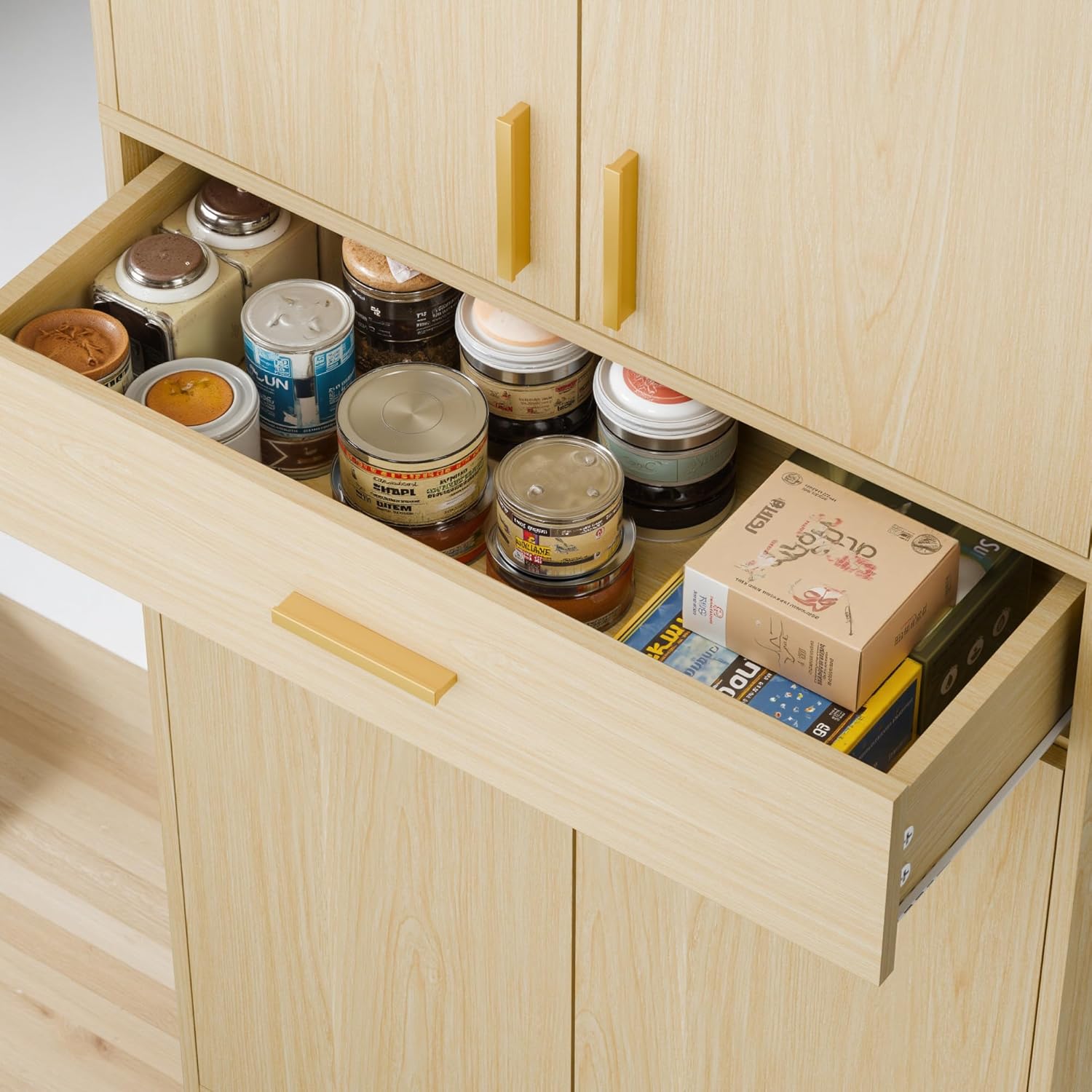 - Modern Pantry Cabinet: Designed in a modern style that prioritizes ergonomic comfort, this cabinet is tailored for easy access to items by adults; The metal handles provide a comfortable grip and ensure long-lasting use; The doors offer a quiet and comfortable experience, combining practicality with aesthetics