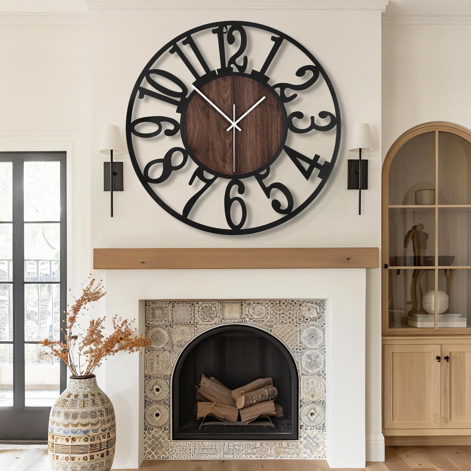 Maxstar Large Round Wall Clock for Living Room Decor Battery Operated Non Ticking Black Metal Wood Clocks for Home Living Room Garden Office Kitchen Decoration -40inch