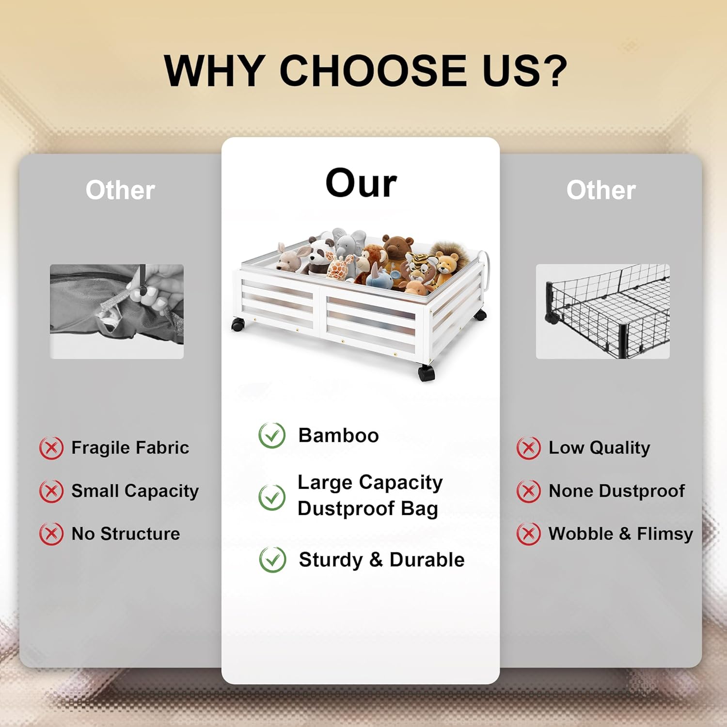 - ✅【Sturdy Under Bed Storage】:Our underbed storage units are built to last with high-quality 100% Real Bamboo,Beautiful appearance compared,oasting 4 rotating wheels with capacity of 120lbs, 48L large capacity dustproof cover bags hile the load-bearing capacity and durability are dramatically increased ,It's a versatile storage solution that can be customized based on your needs.