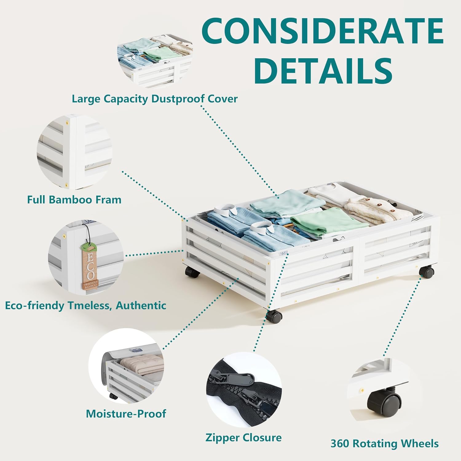 Under Bed Storage with Wheels-Large Bamboo Underbed storage Containers with Large Dust Bag Stackable Under the Bed Shoe Storage Bins for Clothes Books Bedding (2 Packs White, 23.62"L×16.54"W× 6.51"H)