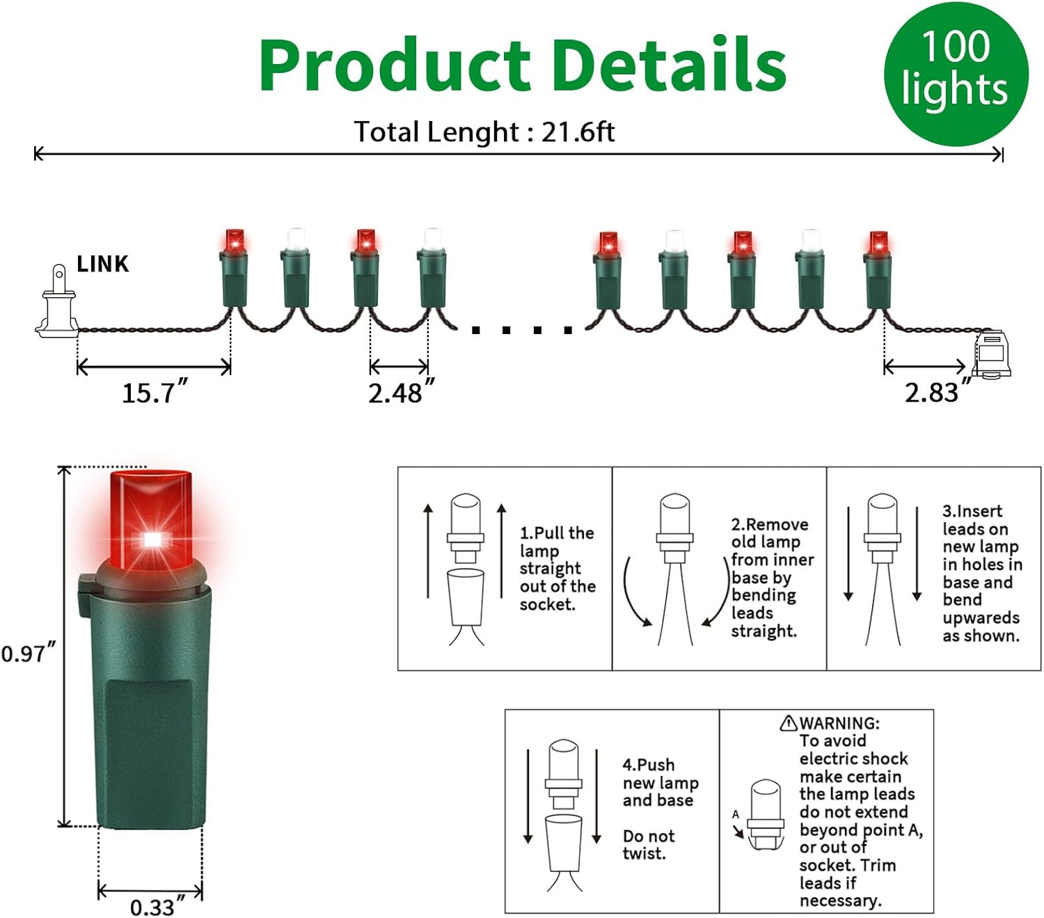 - 5mm LED Christmas Lights: 100 counts Red and White 5mm wide angle stable LED string lights spaced 6.3 inches apart with green wire. 7.1 inch leads have a stackable male plug and 5.9 inch tails have a female plug for easy end to end connection.
