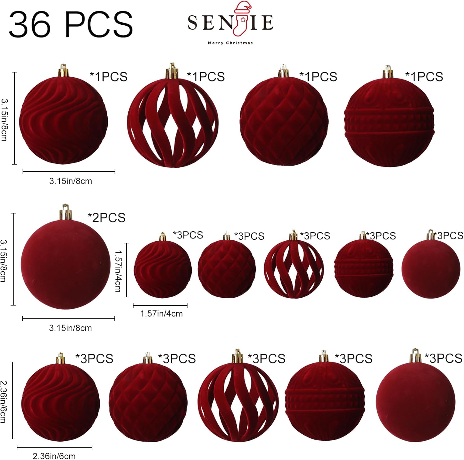 - Package List: the package contains 36pcs of flocked Christmas ball ornaments, measuring approx 3.15/2.36/1.57/inches in diameter, red color,not only classic styles,but also innovative styles,including five shapes and nice texture can fully meet your needs for decorating