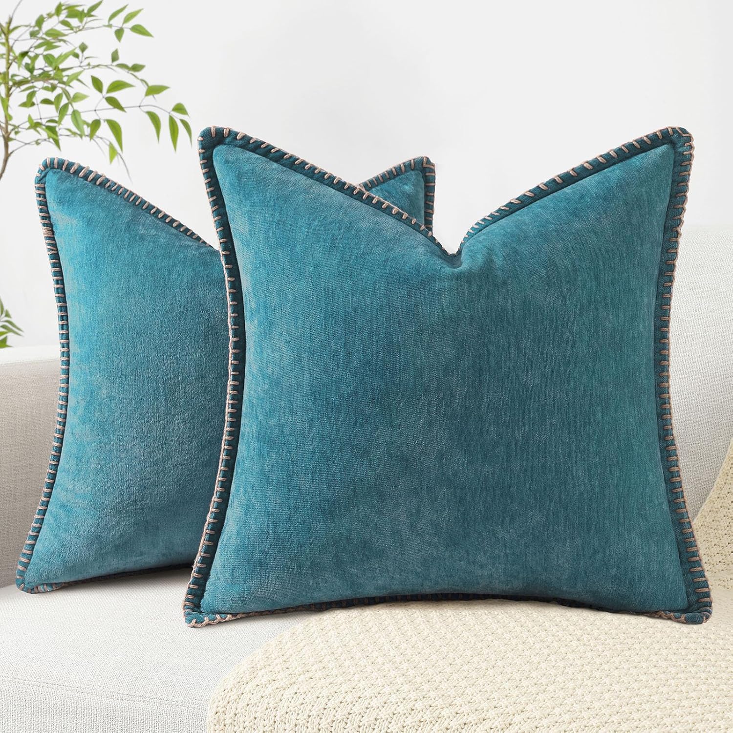 decorUhome Chenille Soft Throw Pillow Covers 18x18 Set of 2, Farmhouse Velvet Neutral Decorative Euro Pillow Covers with Stitched Edge for Couch Sofa Bed Home Decor, Teal