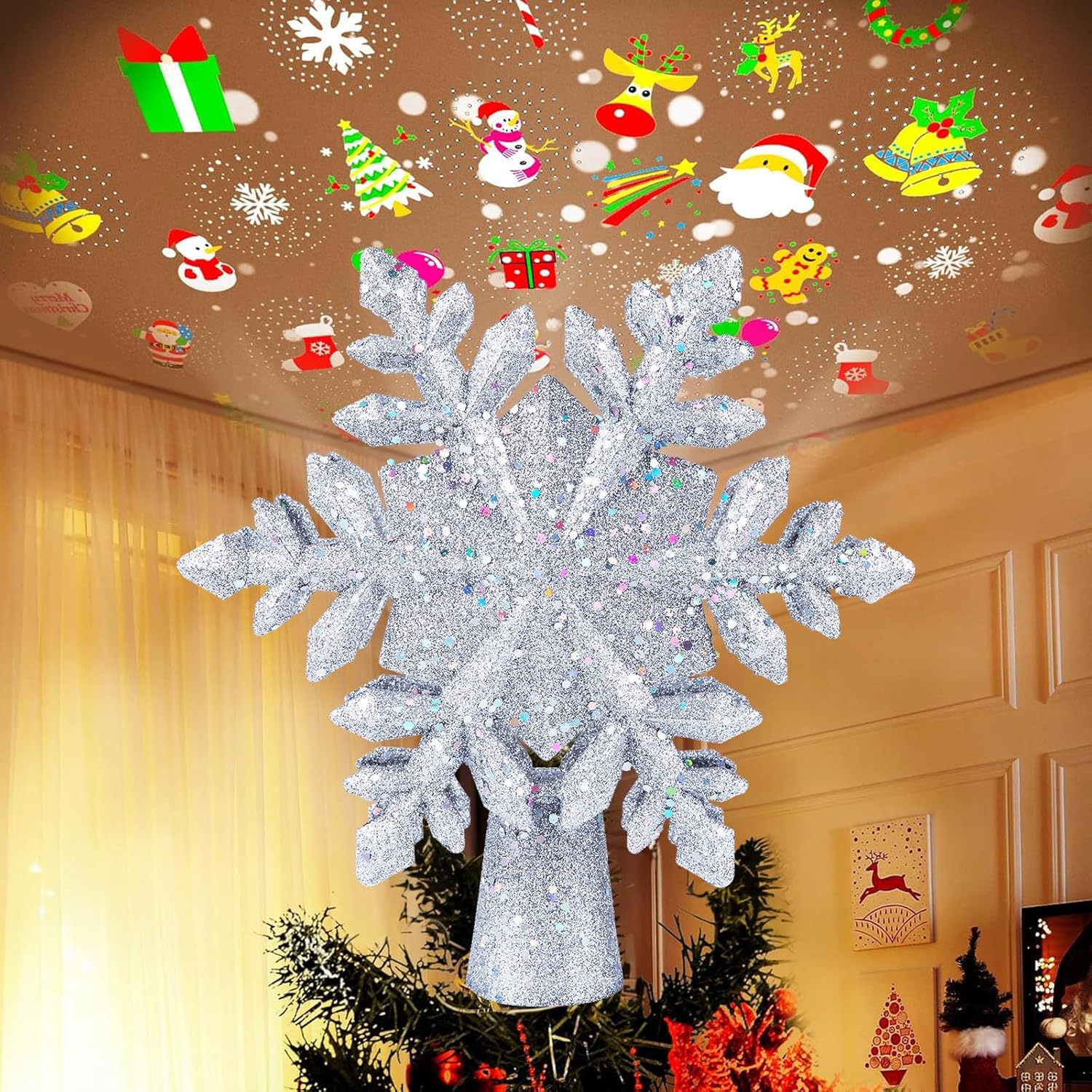 - 【Adds Christmas Atmosphere】This tree topper with projector is a great choice for completing your Christmas tree decoration. It can be used as a Christmas tree topper, table centerpiece, or ceiling accent, and is suitable for Christmas, weddings, and everyday home décor. With this sparkling projector tree top light, your home will be filled with warmth and charm.