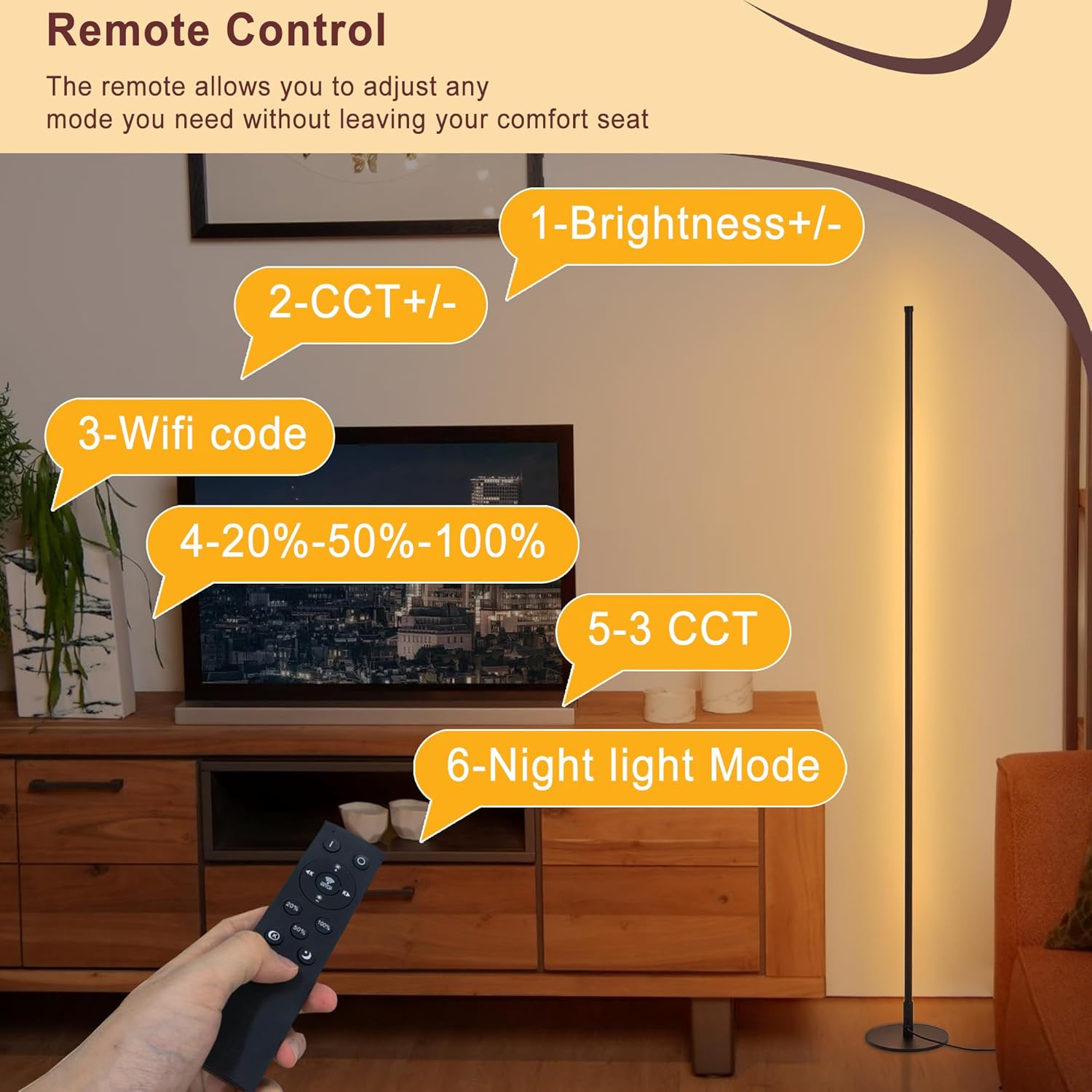 - Convenient Control Options: Our corner lamp offers two convenient control options for your ease. You can use the included remote control to adjust the settings from anywhere in the room, allowing you to customize your lighting experience. Additionally, a foot switch is located of the lamp for easy access. Whether you're relaxing, working, or reading, you can easily find the most comfortable brightness level with our stepless dimming feature.