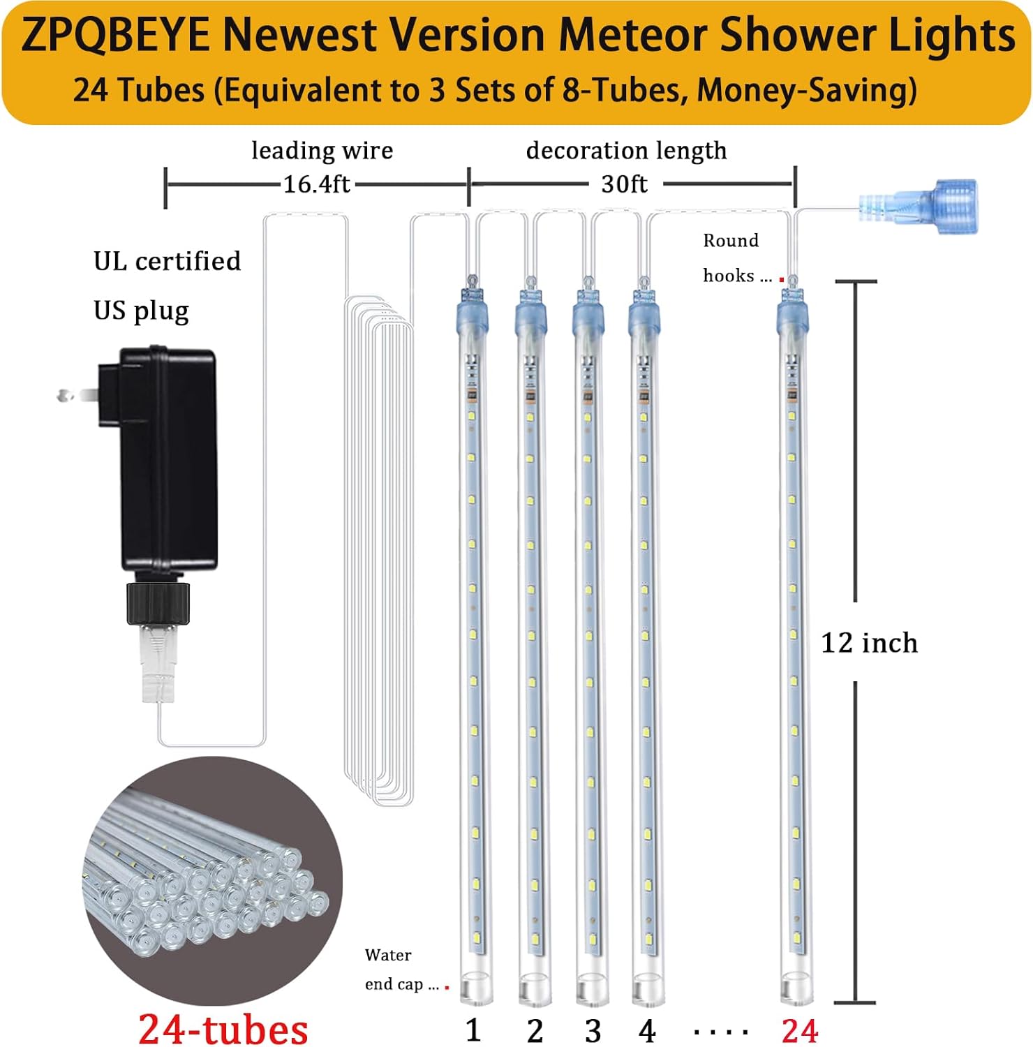 - NEW UPGRADED 24 Tubes Meteor Shower Lights: ZPQBEYE Christmas Outdoor lights have 24 tubes (equivalent to 3 sets of 8-tube), 576 LEDs attached on both sides, adopted super bright LED chips, providing 360 degree shining angles. which makes the Christmas icicle lights, much brighter and more attractive. When dark falls, Each bulb twinkles with a romantic glow, opening and closing in succession, resembling a meteor shower or drifting snow, creating a breathtakingly beautiful effect.