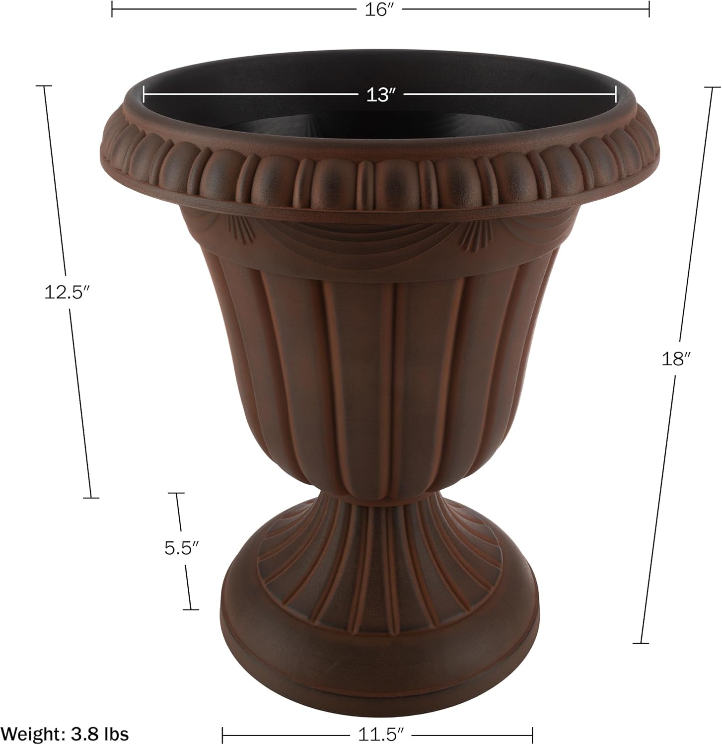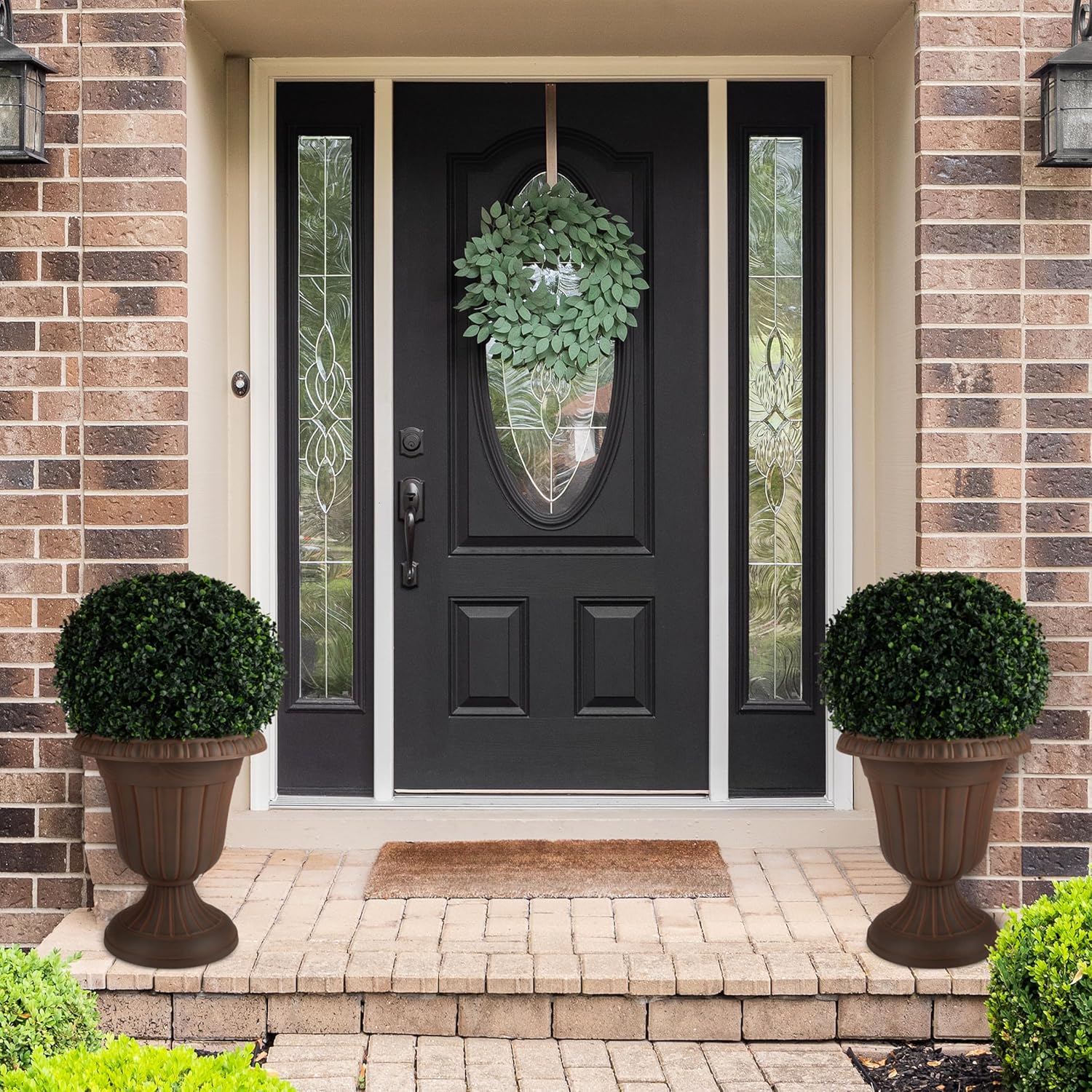 - PRODUCT DETAILS - Materials: Recycled Polypropylene Plastic. Dimensions: (L) 16” x (W) 16” x (H) 18”; Weight: 3.8lbs; Interior Planting Space: 13” Diameter x (H) 12.75”; Soil Capacity: 30lbs/13.6L. Front Door Planters Outdoor Set of 2. Color: Brown.