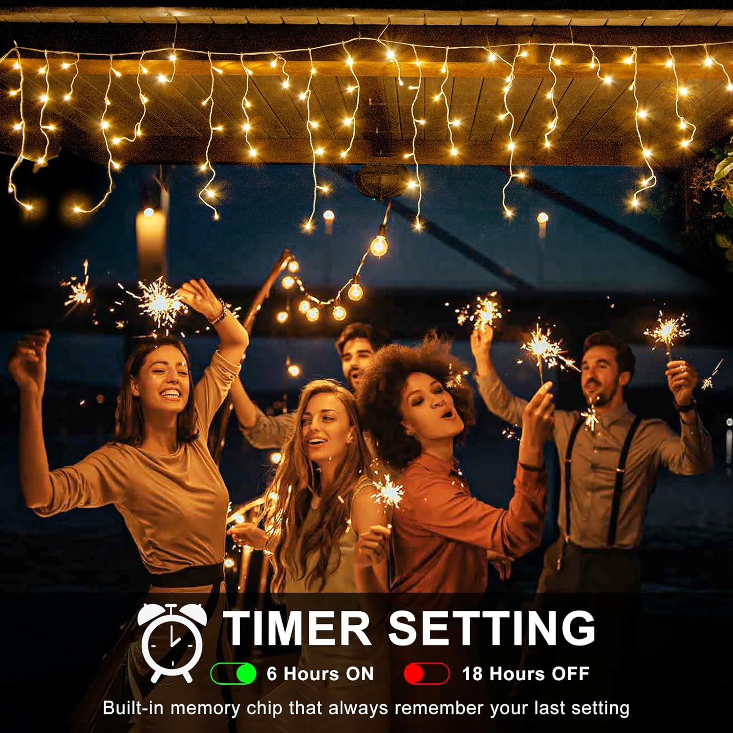 - 【Convenient Timer Function】Activate the timer by pressing the adapter button for 3 seconds. The icicle lights indoor will automatically turn on for 6 hours and off for 18 hours, saving you the hassle of manual operation. These Christmas icicle lights can be easily draped or hung on outdoor roofs, yards, windows, patios, gardens, fences, or in indoor bedrooms, perfect for adding festive charm to every corner of your home.