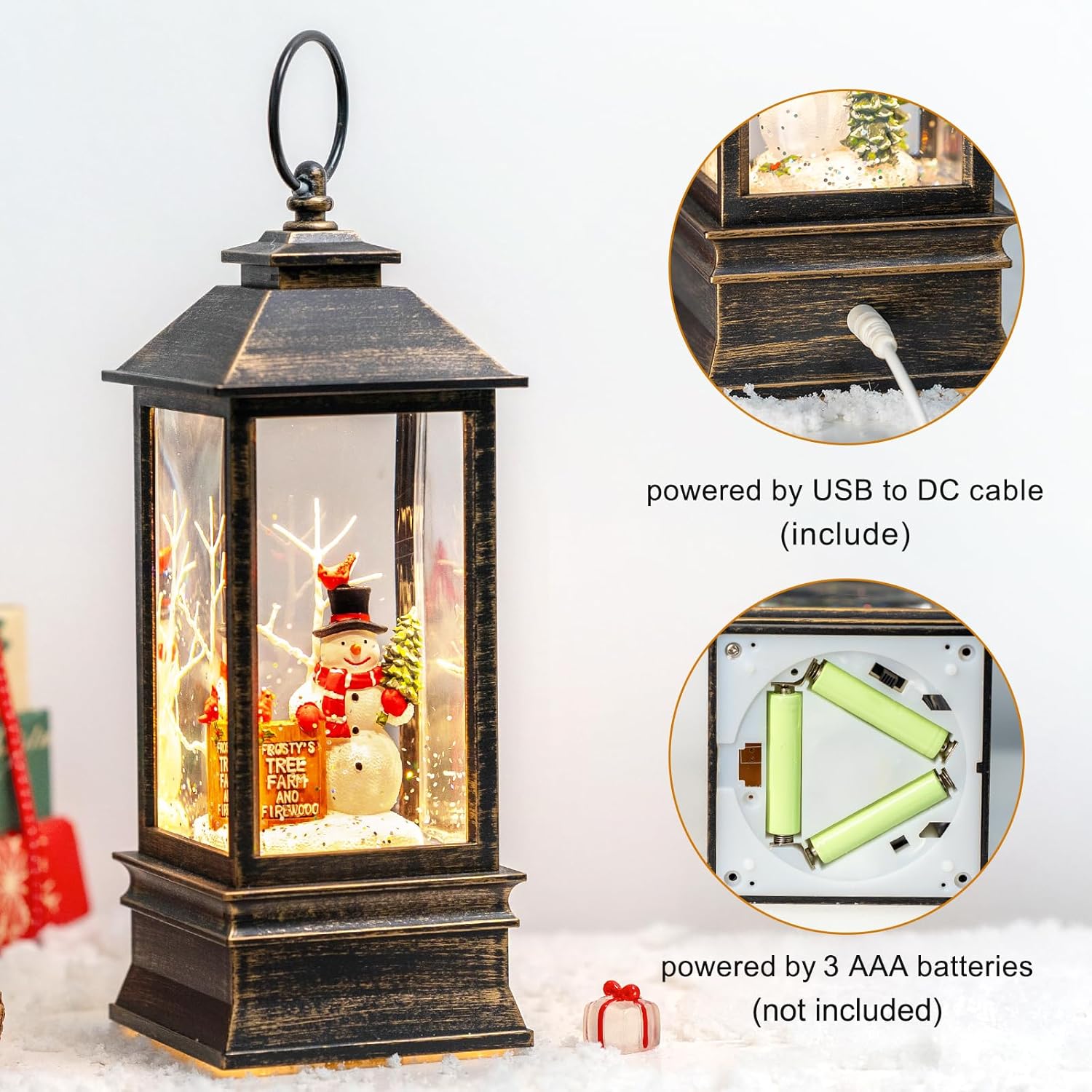 - 【 Battery & USB 】The christmas snow globe comes with the USB,you can charge by USB. It is also powered by 3 AA batteries (Not Included). It allows you to put it wherever you want to decorate, indoors or outdoors. This snowglobes christmas lantern is flexible and convenient,Don't worry about finding a power outlet.