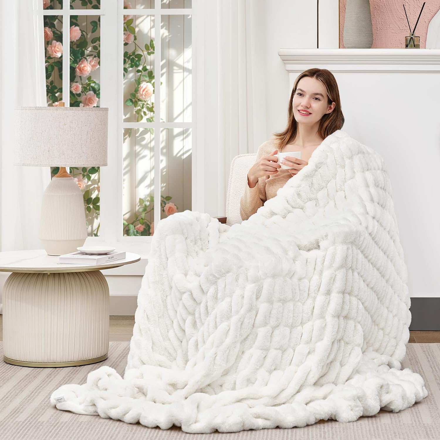 Touchat Ruched Faux Rabbit Fur Throw Blanket, 700 GSM Luxury Dual-Sided Soft Cozy Blanket, Fuzzy Fluffy Plush Blanket for Bed, Couch and Sofa - 50"x60", Cream White