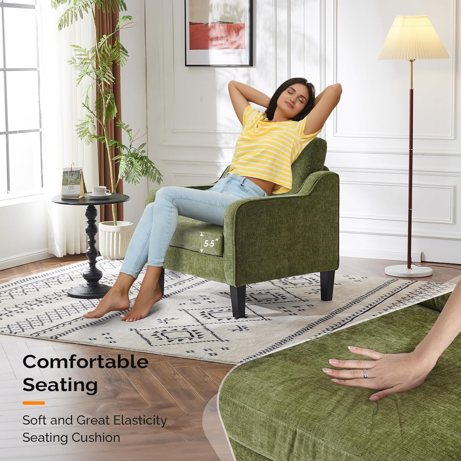 - Built for Stability and Durability--This living room chair features soft chenille material, resilient foam cushions with steel springs, a sturdy metal backrest, a wooden frame, and solid wood legs. It provides exceptional stability and seating support, boasting a weight limit of 380lbs ensuring a comfortable experience.