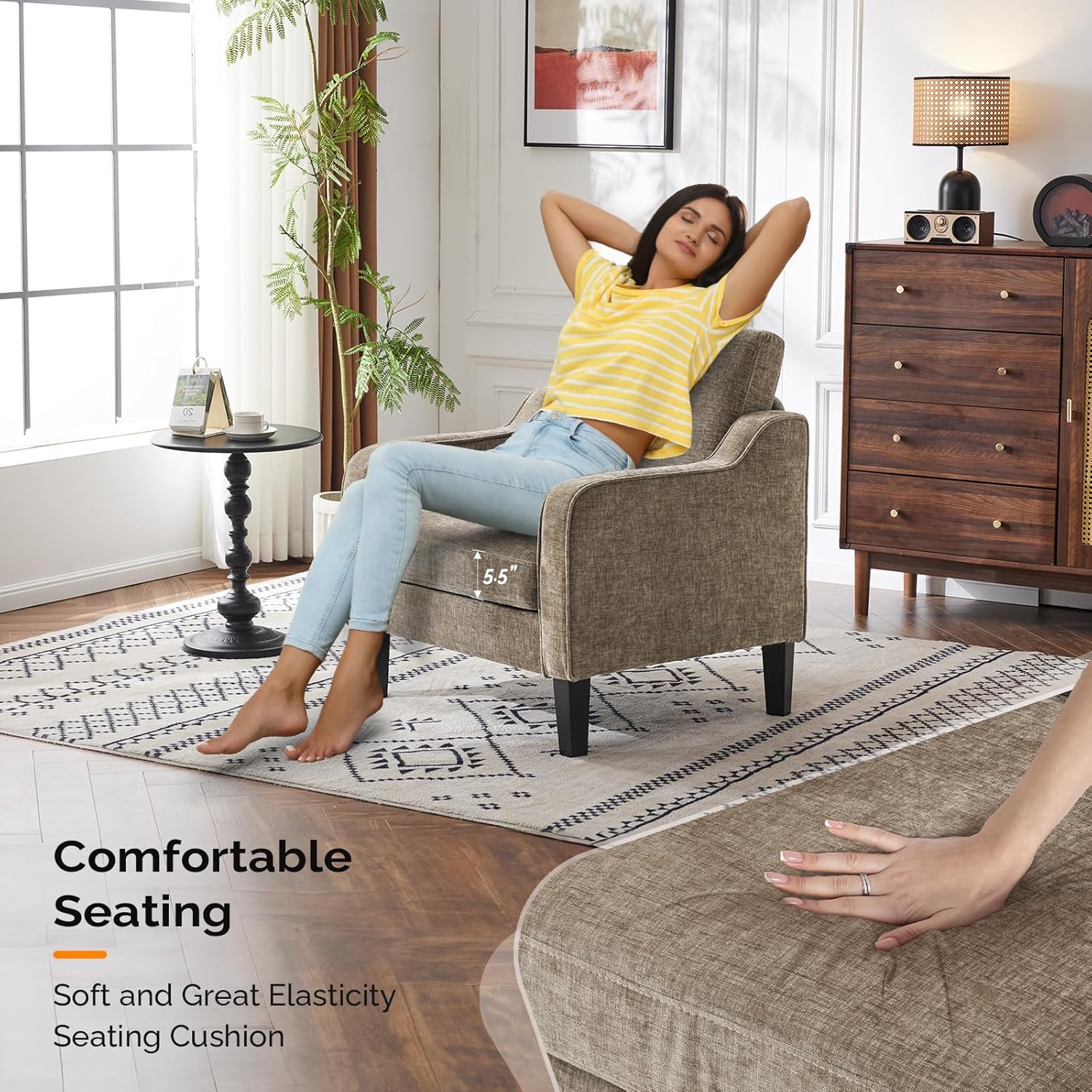 - Built for Stability and Durability--This living room chair features soft chenille material, resilient foam cushions with steel springs, a sturdy metal backrest, a wooden frame, and solid wood legs. It provides exceptional stability and seating support, boasting a weight limit of 380lbs ensuring a comfortable experience.