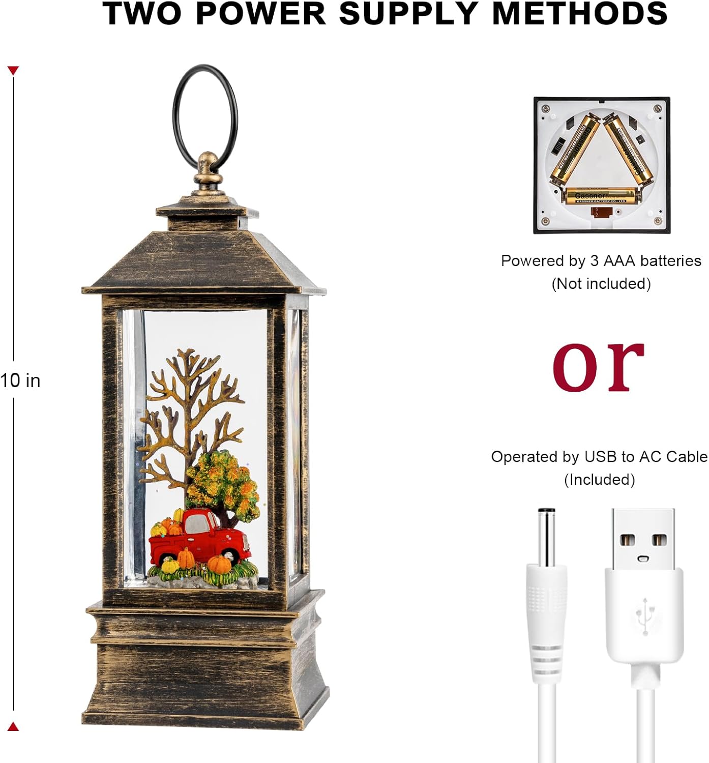 - ๐ใCelebrate Fall Harvest DayใHarvest scene with a red pickup truck hauling pumpkins lighted Water Lantern Snow globe for the harvest! The Swirling glittering flakes begin to fall from the tree trunk when switching on, impress your guests.
