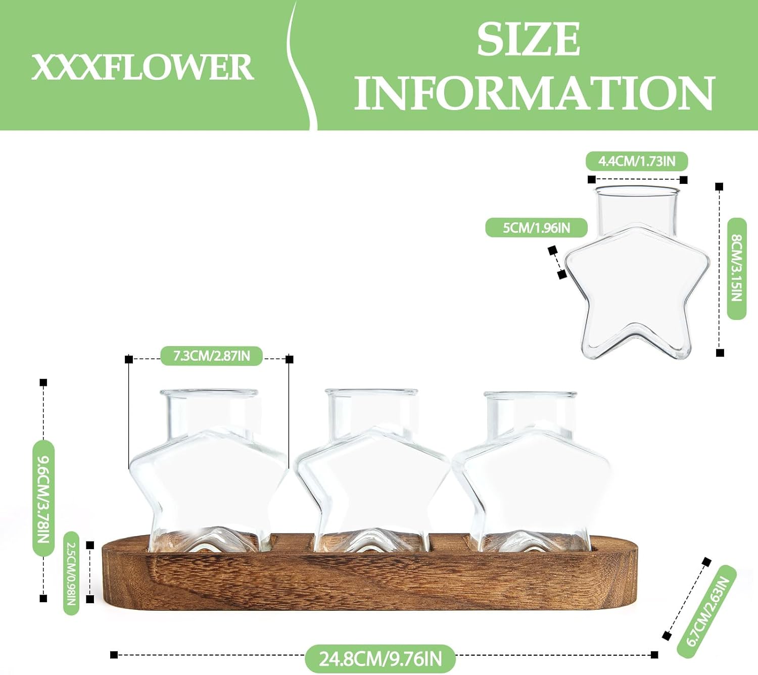 - PLANT GLASS CONTAINER SIZE: The overall size of the star plant propagation station is 9.76x2.63x3.78 inches when assembled. The star vase size is 2.87x1.96x3.15 inches with a mouth diameter of 1.73 inches. Wooden plant stand measures 9.76x2.63x0.98 inches. Package includes star vase x3, wooden tray x1, easy to assemble without tools, easy to clean hydroponic glass vase.