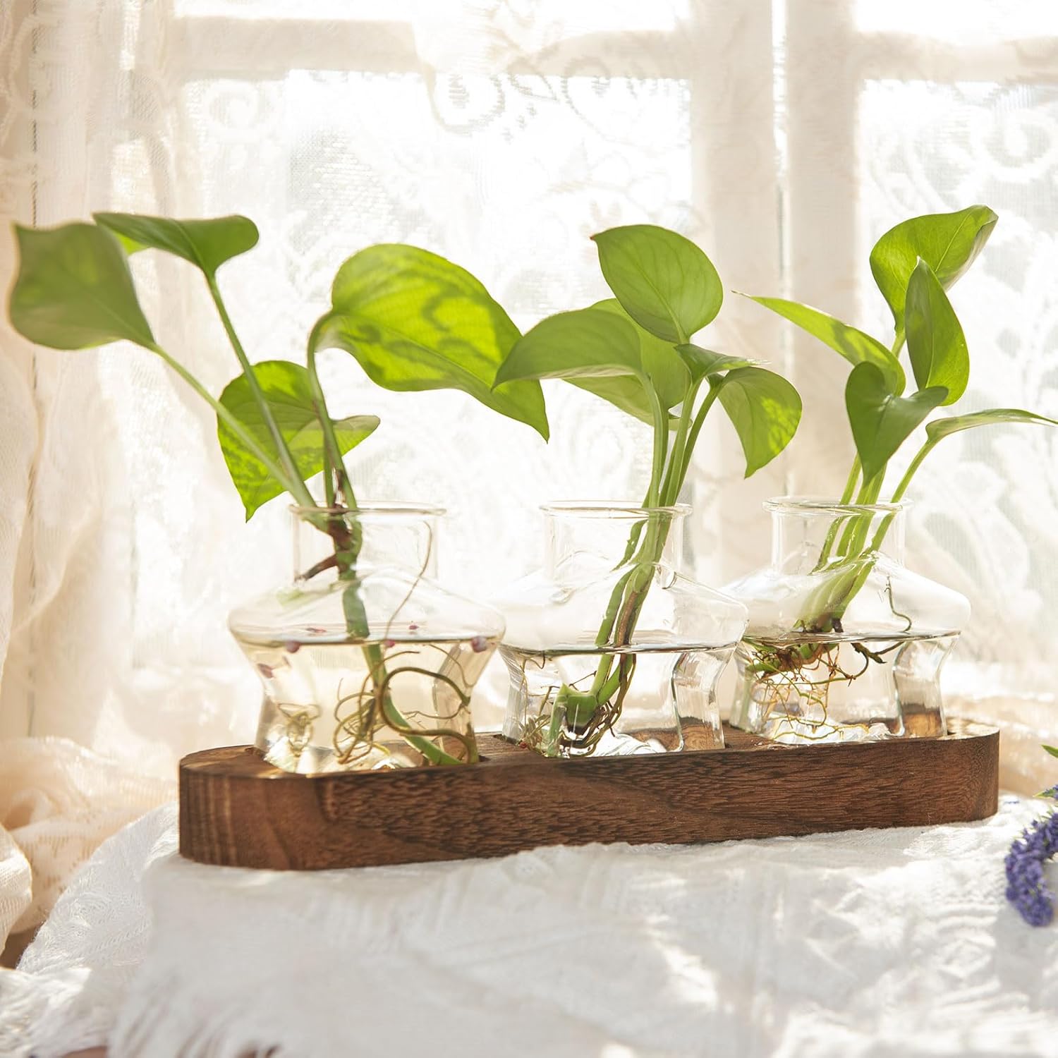 - HIGH QUALITY DESKTOP HYDROPONTIC CONTAINERS: Hydroponic glass vase has a rounded mouth, comfortable to touch and does not hurt your hands. The wooden plant stand is made of high quality tung wood, the bottom of the star-shaped plant propagation vase fits into the wooden tray groove, placing it smoothly and using it with peace of mind. Plant propagation vase is made of high boron glass to create a translucent and bright, sparkling in the sunlight, good-looking and charming, is a romantic life ritual, create a fresh and natural space decorative goodies.