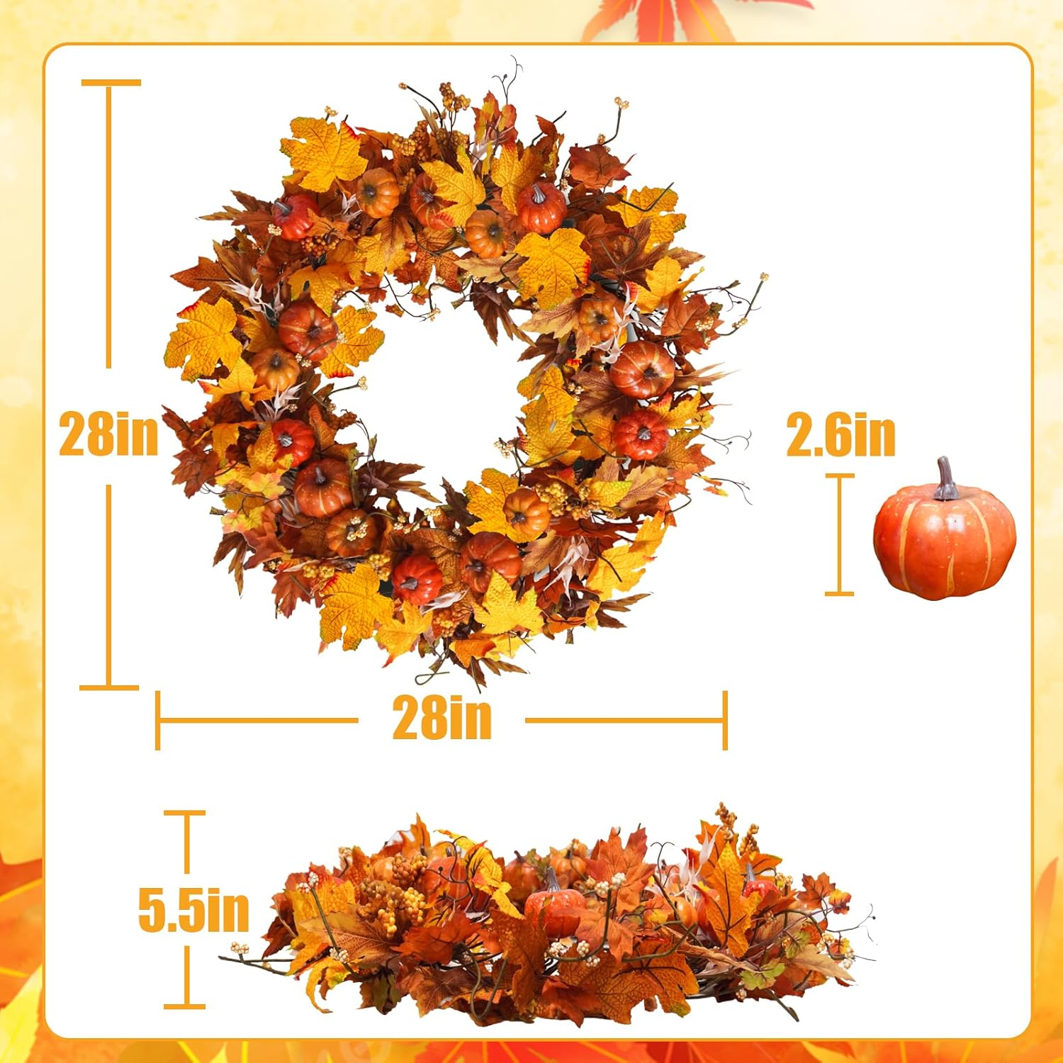 Uieke 28 Inch Fall Wreath for Front Door Outside Large Artificial Autumn Wreath with Orange Red Pumpkins Maple Leaves Berries Fall Decoration for Home Farmhouse Door Wreath for Harvest Thanksgiving
