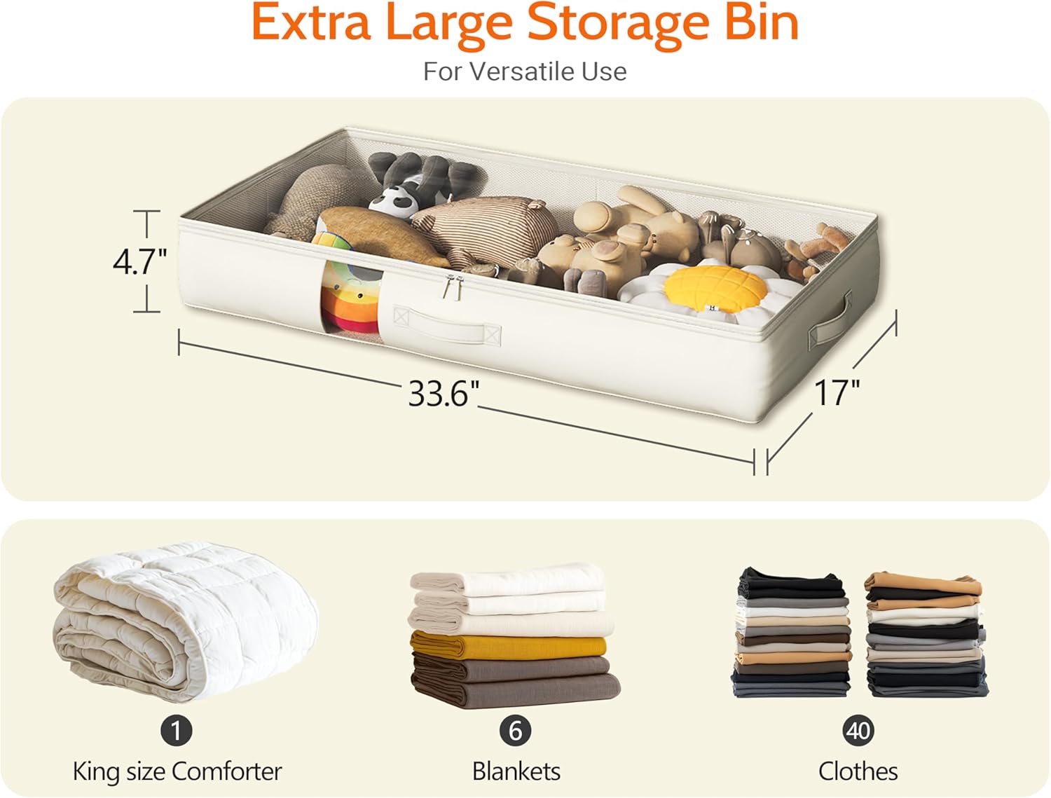 Under Bed Storage Containers with Window, Closet Organizers and Storage Bags, Foldable Underbed Storage Bags for Blankets, Clothing, Comforter, Linen Sheets, Wrapping Paper, 2 Pack, White Ivory