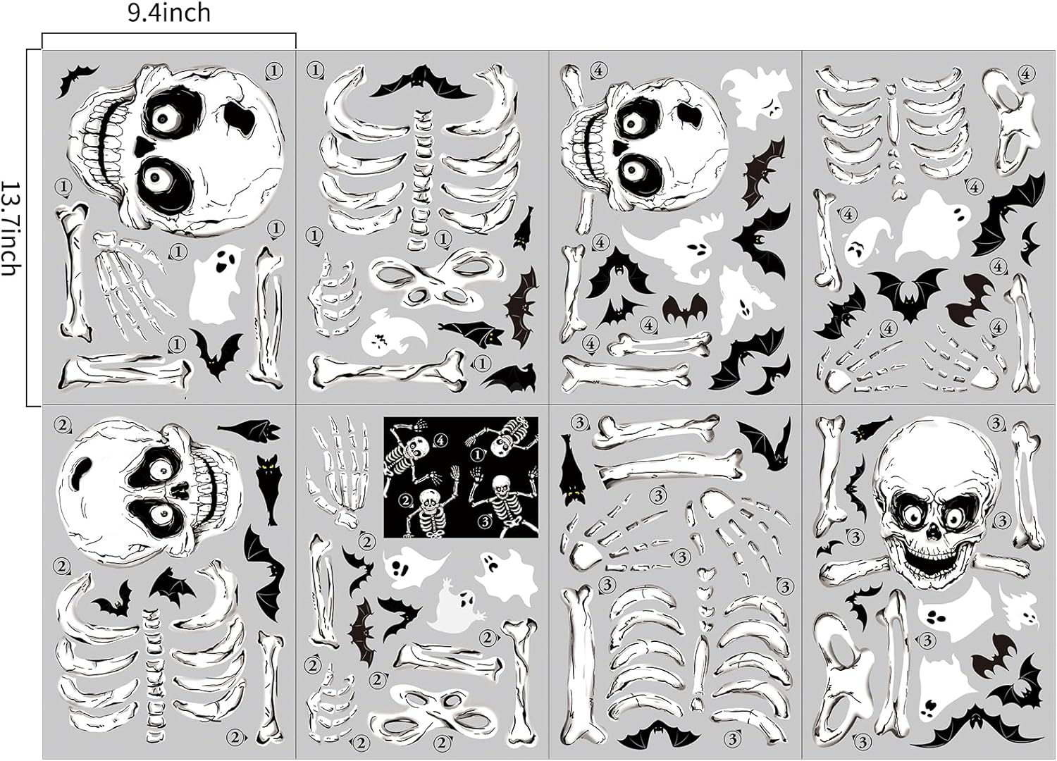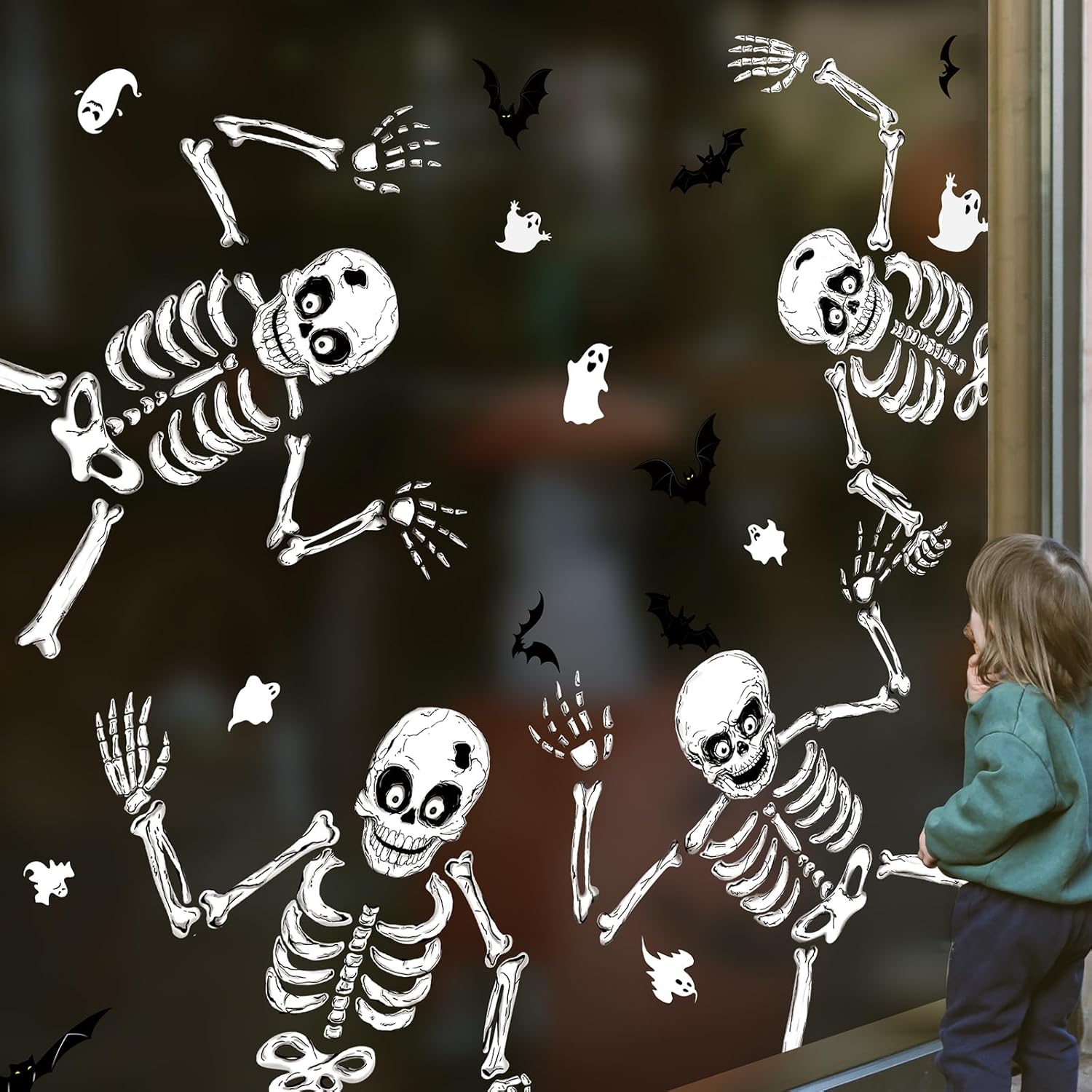 Halloween Window Skeleton Clings – 8 Sheets of Extra Large Cute and Scary Skeletons, Ghosts, and Bats for Home, School, Car Windows, Office, and Party Decor