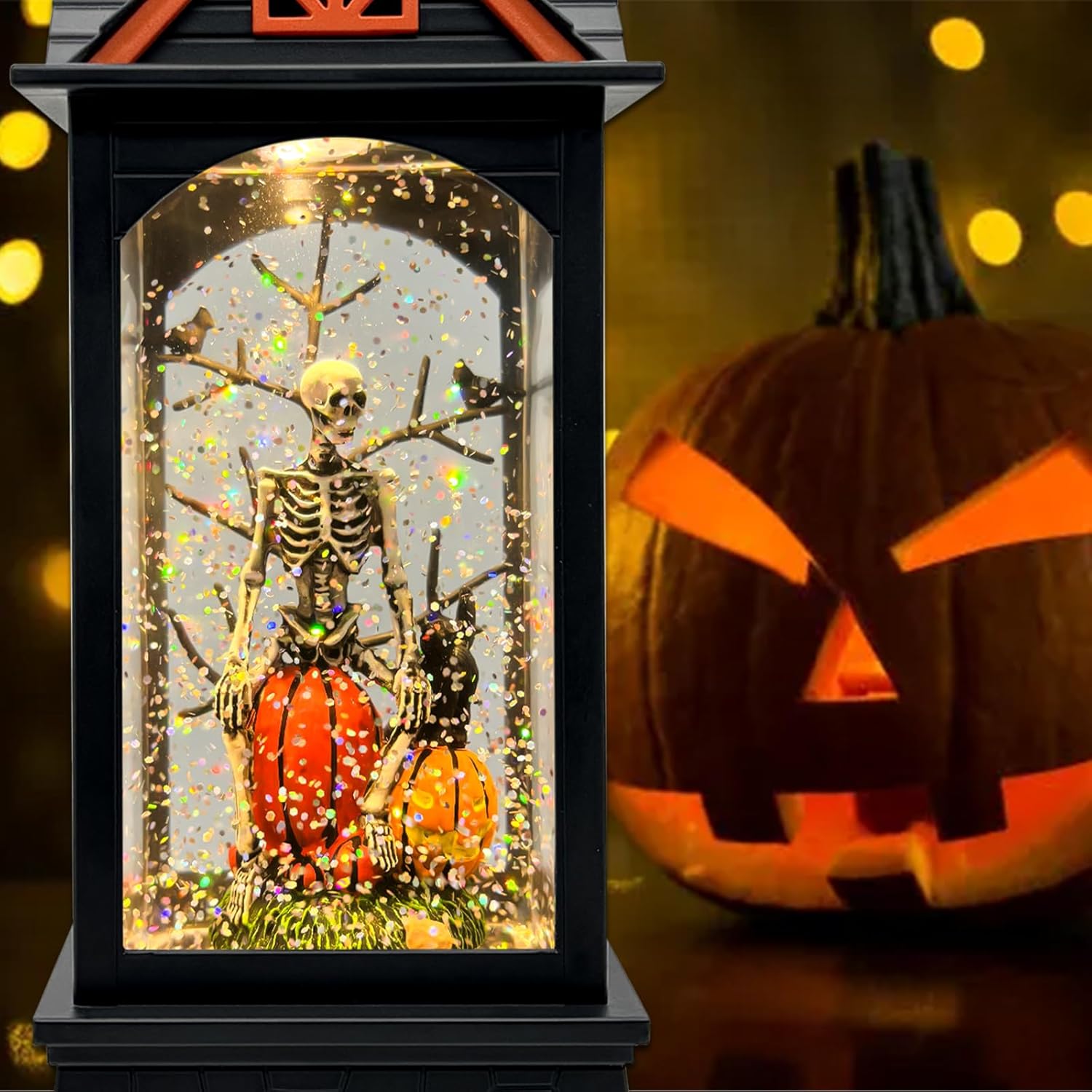 Halloween Snow Globe Lantern with 6 Hour Timer,Halloween Decorations Indoor for Home,Halloween Decor,USB or Battery Powered for Halloween Lanterns,Halloween Skeleton-B