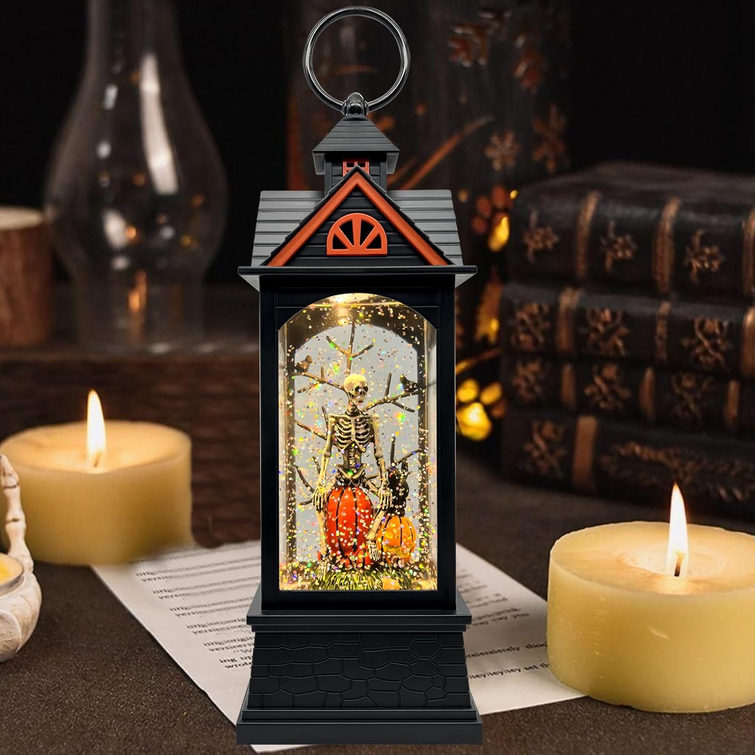 - Halloween Snow Globe: The exterior resembles a mysterious house; inside, you’ll find elements like skeletons, pumpkin lanterns, and a spooky town — creating an eerie charm when illuminated in dim light… evoking the mysterious atmosphere of Halloween — its unique creativity makes it the top choice for Halloween decorations indoors and Halloween gifts
