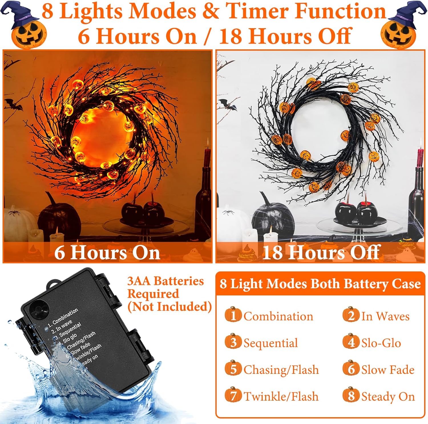 - 【8 Lighting Modes & Timer】You can use the halloween garland battery box button to switch 8 Flashing Modes:Combination,In Waves,Sequential,Slow Glow,Chasing/Flash,Slow Fade,Twinkle/Flash,and Steady On,the light will be automatically timed and keep on for 6 hours ,automatically turn off for 18 hours