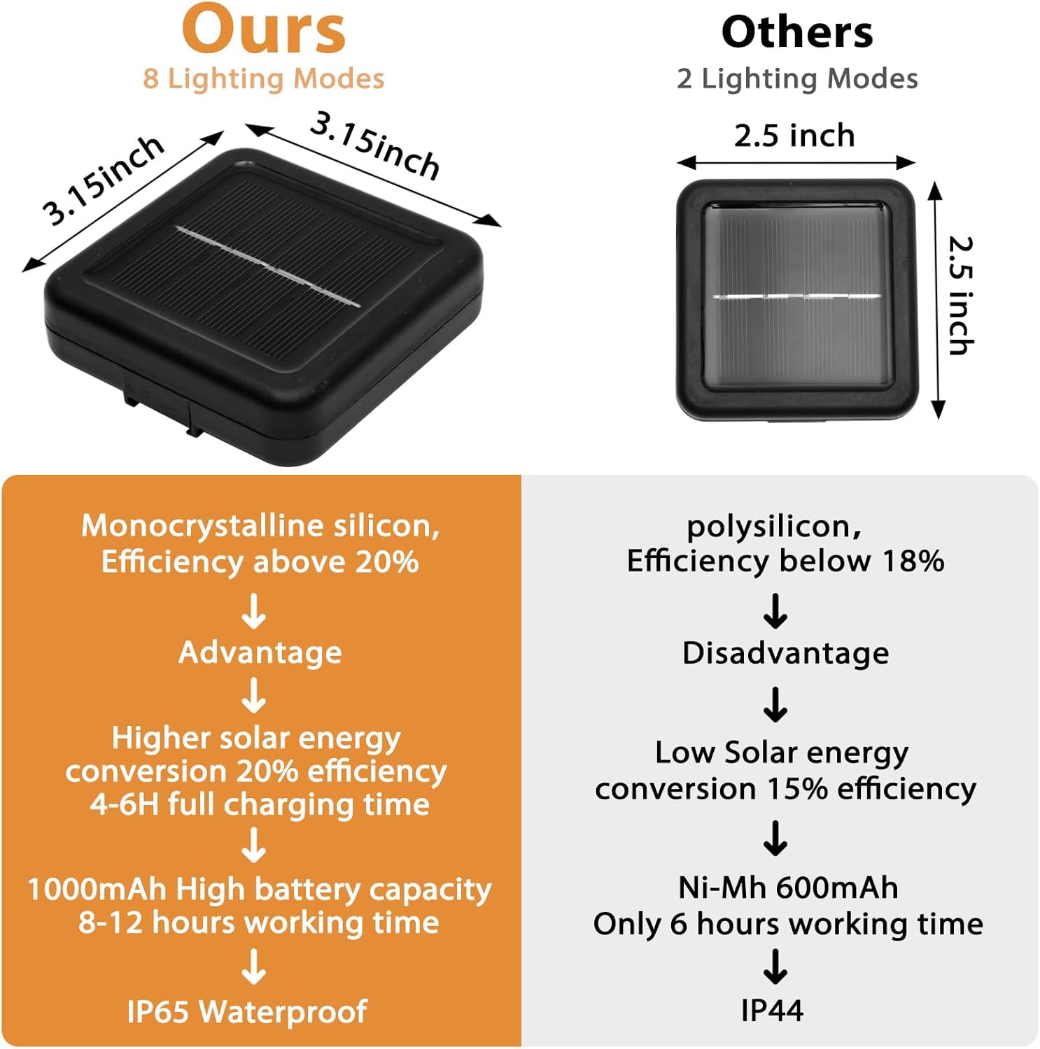 - 【Upgraded Solar Panel & Large Capacity Battery】Solar string lights for outside are equipped with precision 180 degree adjustable 3.15x3.15inch monocrystalline silicon solar panels,built-in 1000mAh large capacity battery,lights up for all night (8-12 hours) after fully charged.