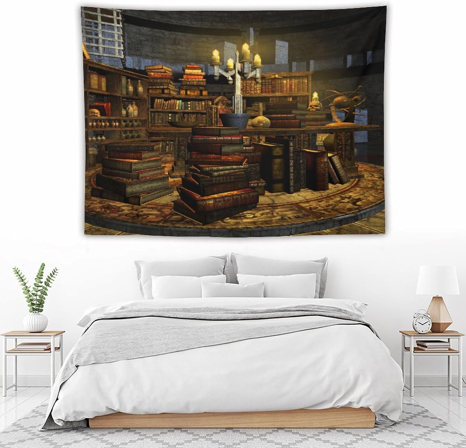Kurtect Library Tapestry,Vintage Medieval Bookshelf Wooden Bookcase Antique Magic Art Tapestries for Party Beach Picnic Blankets Tablecloths Living Room Wall Deocr, 60x80 in
