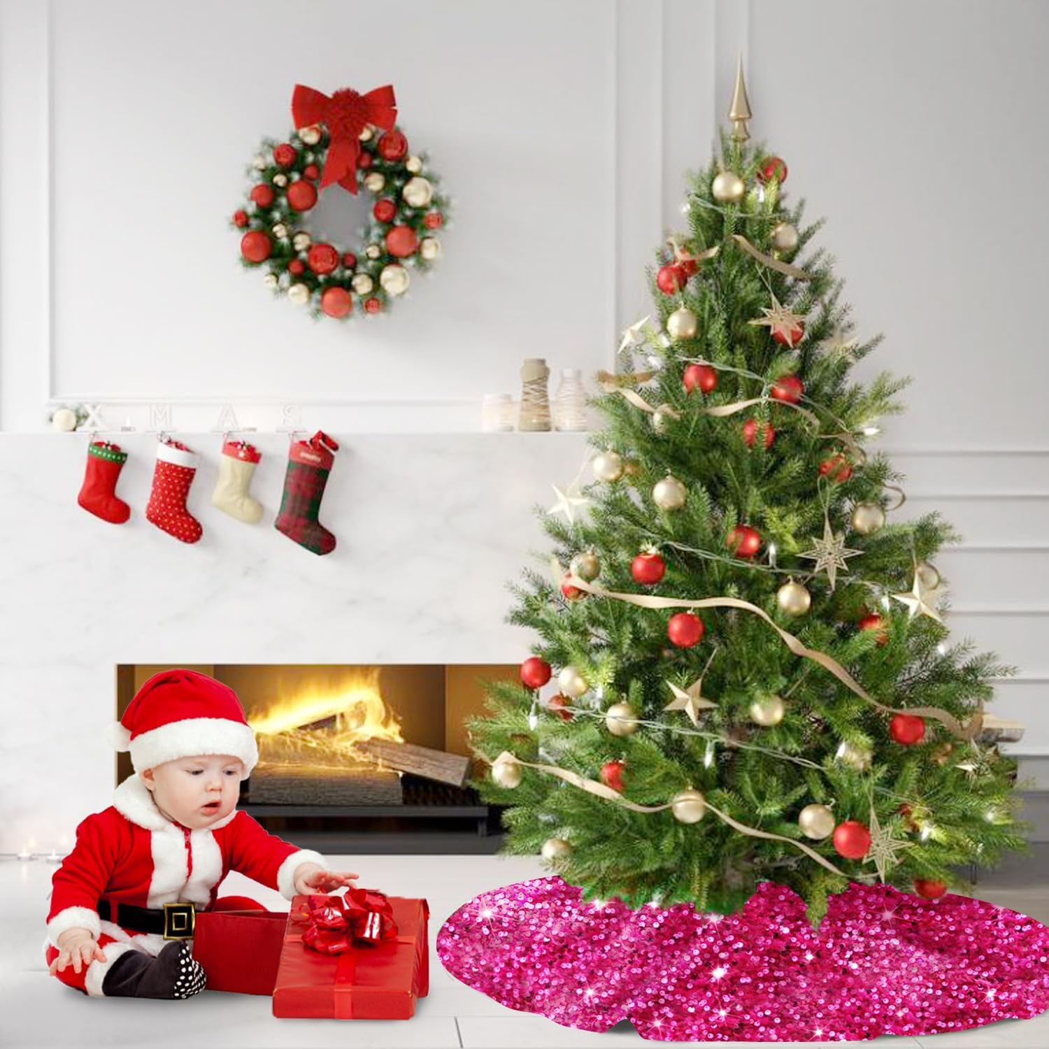 - ❄️【Size Detail - Hot Pink Tree Skirt】You will receive a 36 inches diameter hot pink tree skirt, fitting under 4-6 foot trees. You can put some gifts, Christmas boxes, Christmas ball on the Christmas tree base cover . The sparkle Christmas tree blanket is perfect for decorating your home and become part of your holiday tradition.