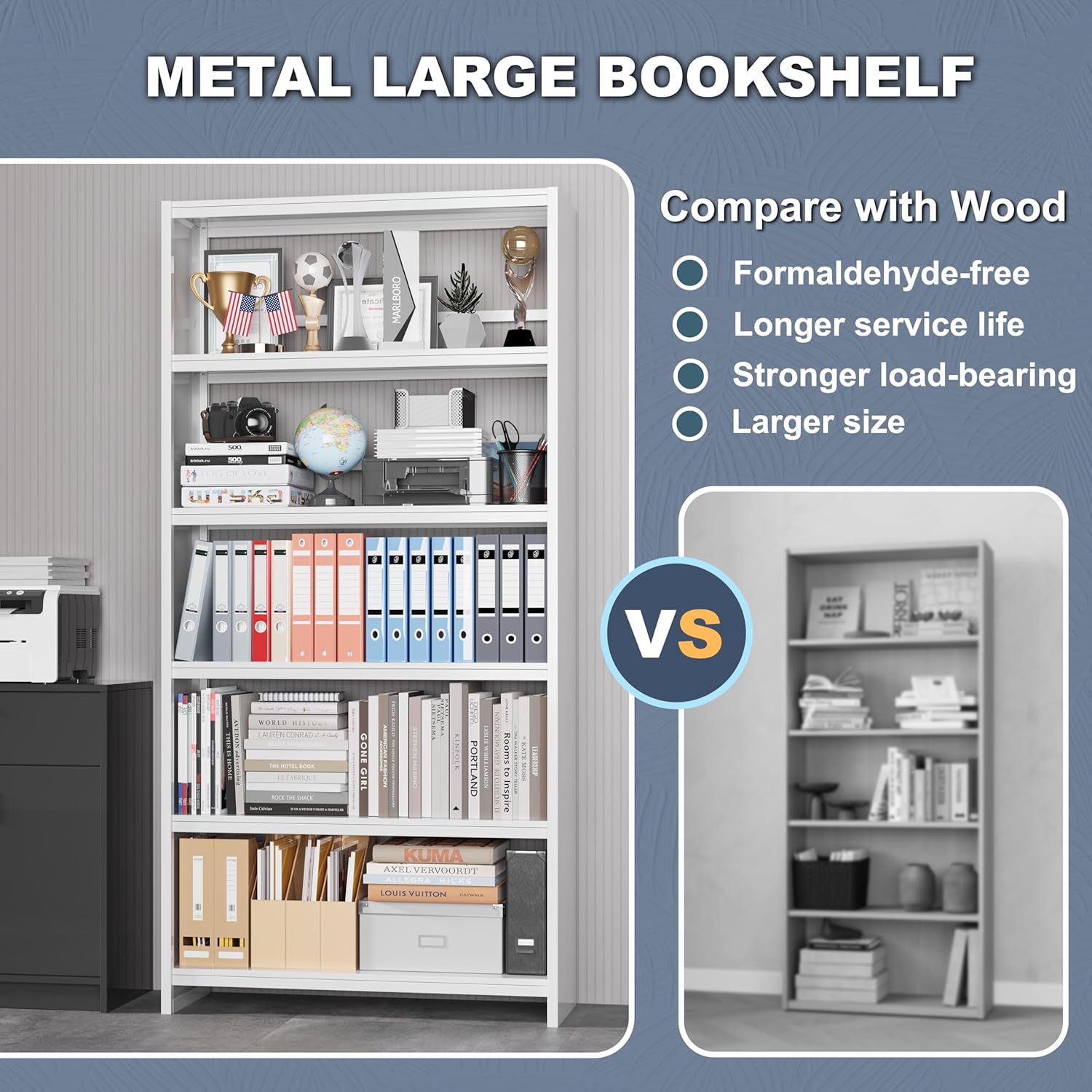 69" Tall Bookcase, 5-Tier Wide Bookshelf, Library Book Case with Display Shelf, Lightweight Metal Bookshelves, Industrial Book Shelf for Home, Office, Library, and School (White)