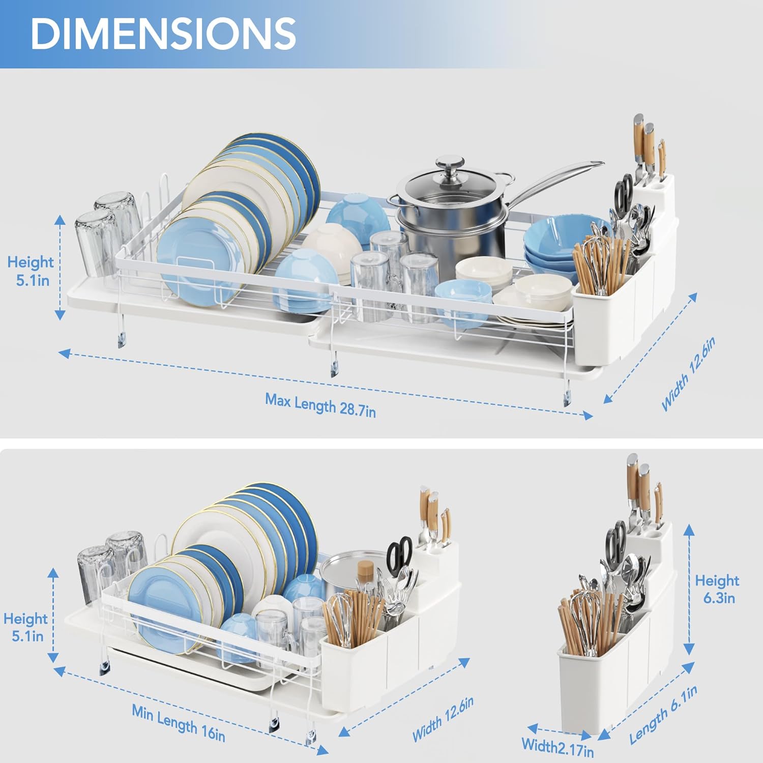 - Expandable Design:ROTTOGOON kitchen dish drying rack with an extendable design can be adjusted to fit different kitchens. It measures 12.6" W *5.1" H, and from 19.2" to 28.7" in length. This dish racks can accommodate plates, bowls, cups, glasses, and even full-sized pots and pans.Therefore, you can just adjust the extendable tray as you need.