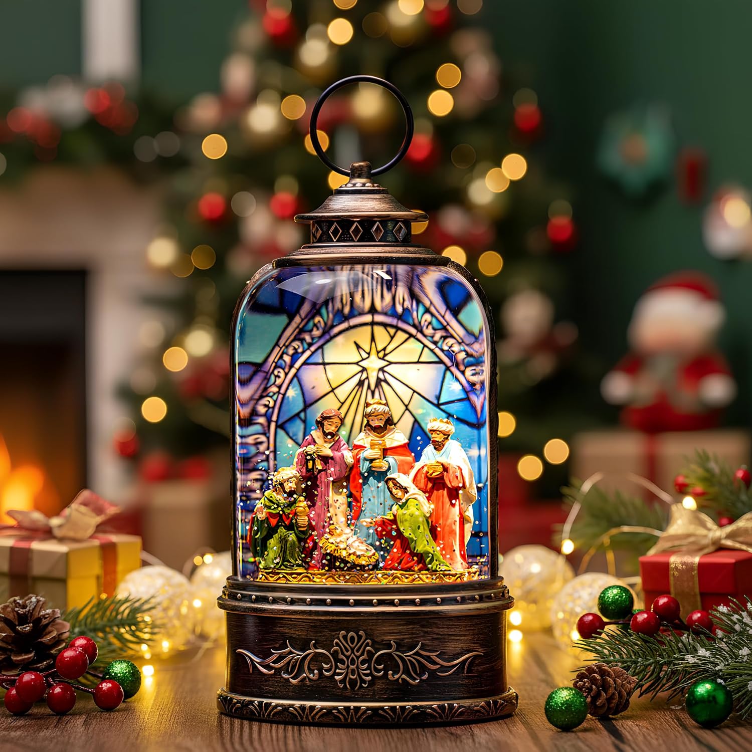 - ๐ ๐ใNativity Figurines LanternใThe Holy Family Figurines Scene design, When turned on a warm LED shines on the figurine and swirling glitter to gives our Christmas globe a whimsical look for the Christmas Holiday season.