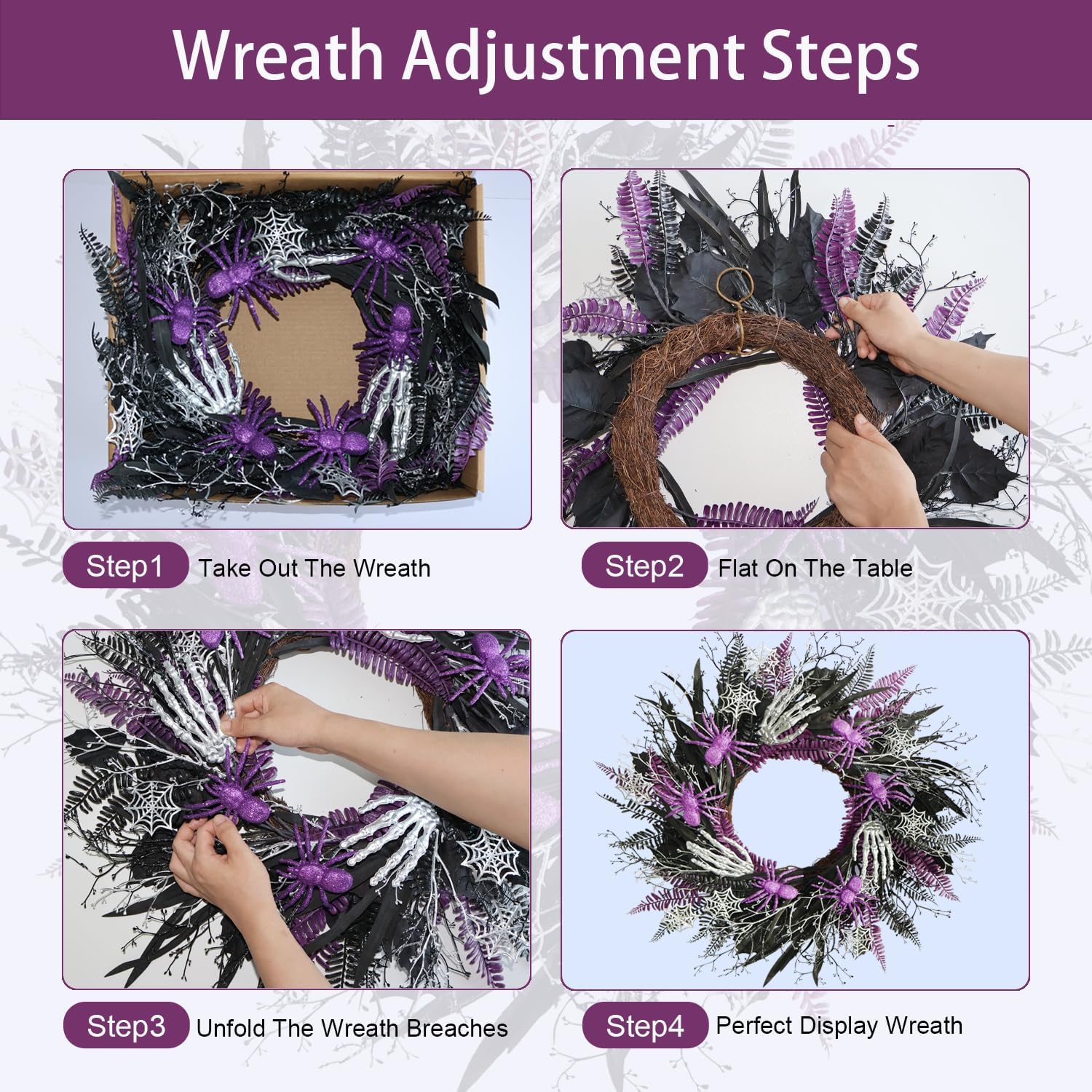 - ๐ Festive Halloween Wreath: Celebrate Halloween with this 20-inch wreath adorned with black & purple leaves, purple Spiders Silver Skeleton Hands, creating a gothic and spooky ambiance.