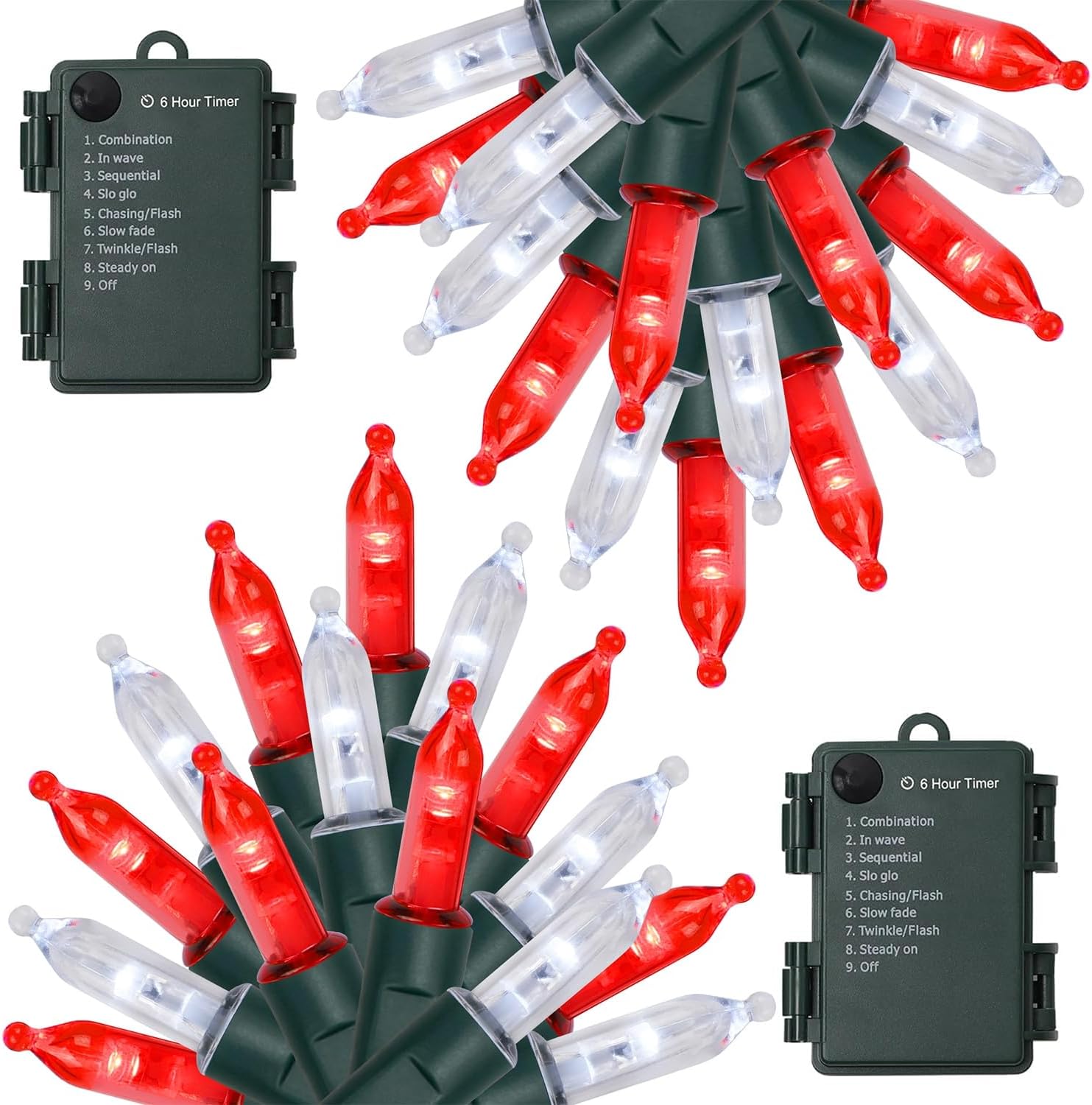 - [8 Lighting Modes]: WATERGLIDE 2 pack 50LED Christmas Red & White mini string lights have 8 lighting modes for you to choose - Combination, In waves, Sequential, Slow Glow, Chasing/Flash, Slow fade, Twinkle/Flash, Steady on. Adjust the lighting modes by pressing the round button on the battery case